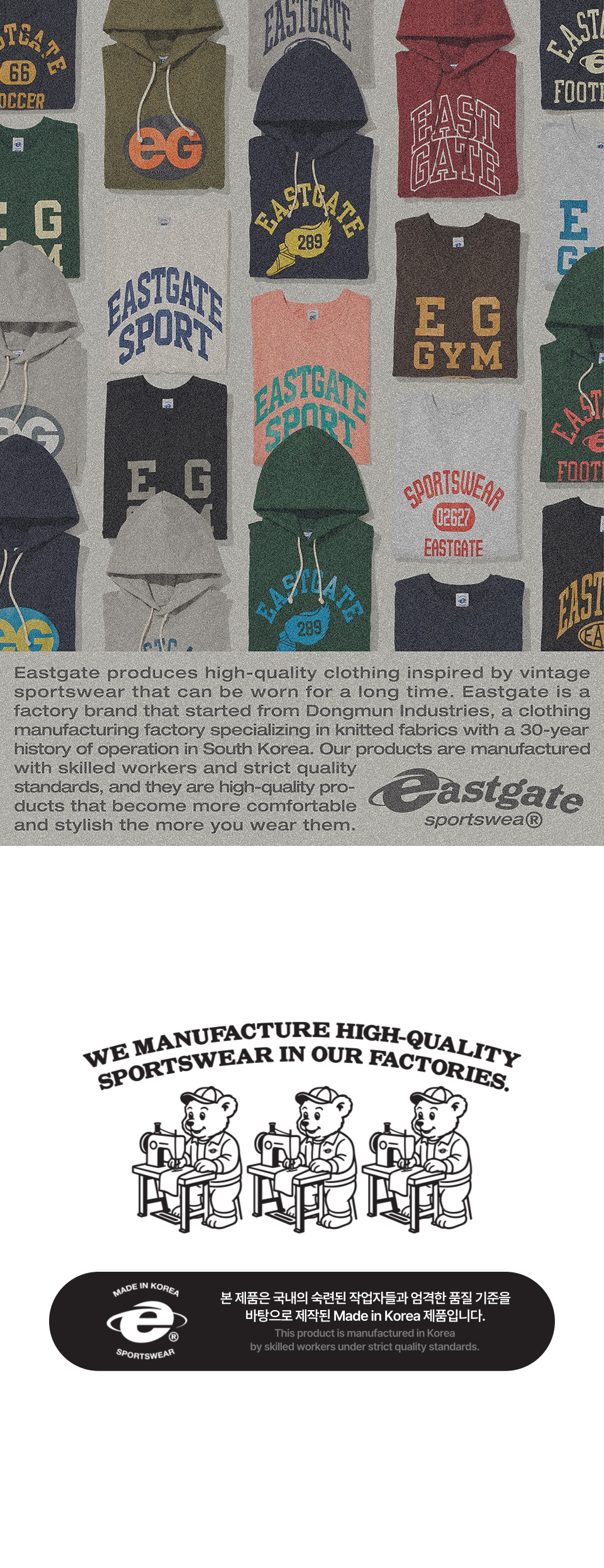 이스트게이트(EASTGATE)는 빈티지 스포츠 웨어를 현대적으로 재해석하여 오랜 기간 착용 가능한 높은 품질의 제품을 생산하며 일상과 스포츠 활동에 편안하게 착용할 수 있는 스포츠 웨어를 만드는 브랜드입니다.