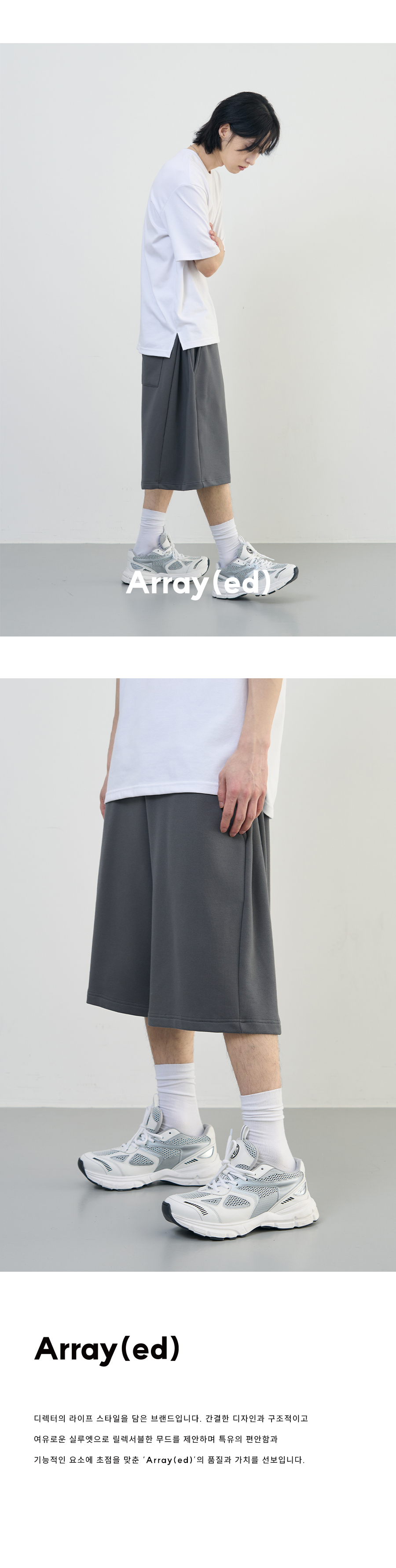어레이드(ARRAYED)는 '특별히 멋진 옷을 입은'이라는 뜻을 기반으로 쉽게 접근할 수 있는 아이템을 재해석하여 실루엣과 디테일에 집중한 디자인을 중점적으로 전개합니다. 잘 만들어진 아이템 하나로 트렌디하고 패셔너블한 대상으로 보이게끔 하고자 합니다. 또한 '배열하다'라는 이중적 뜻을 담아 의류에만 국한된 브랜드가 아닌 라이프스타일과 뷰티 아이템 등 다양한 각도에서 모습을 보여주고자 합니다.
