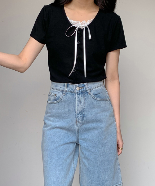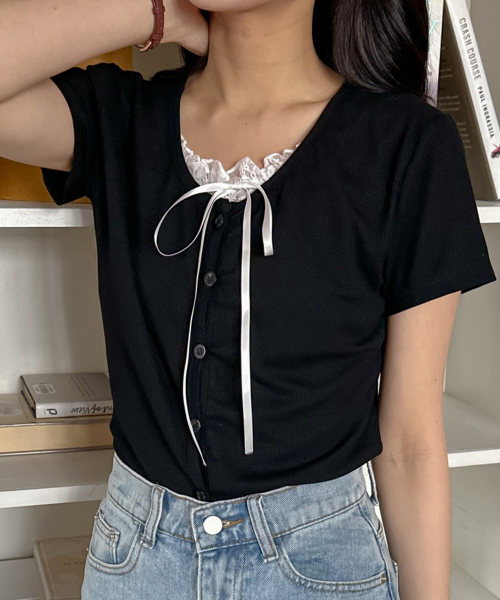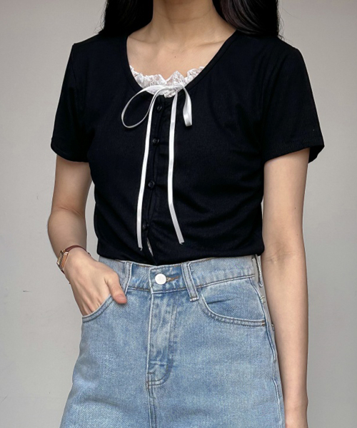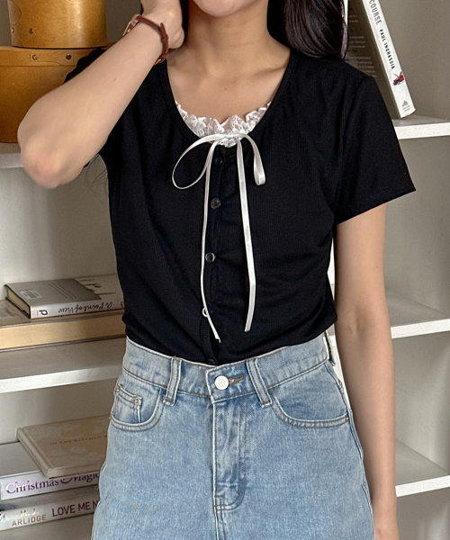 레이스 레이어드 스판 반팔 가디건형 티셔츠