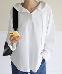 버튼 스트링 후드긴팔 티셔츠