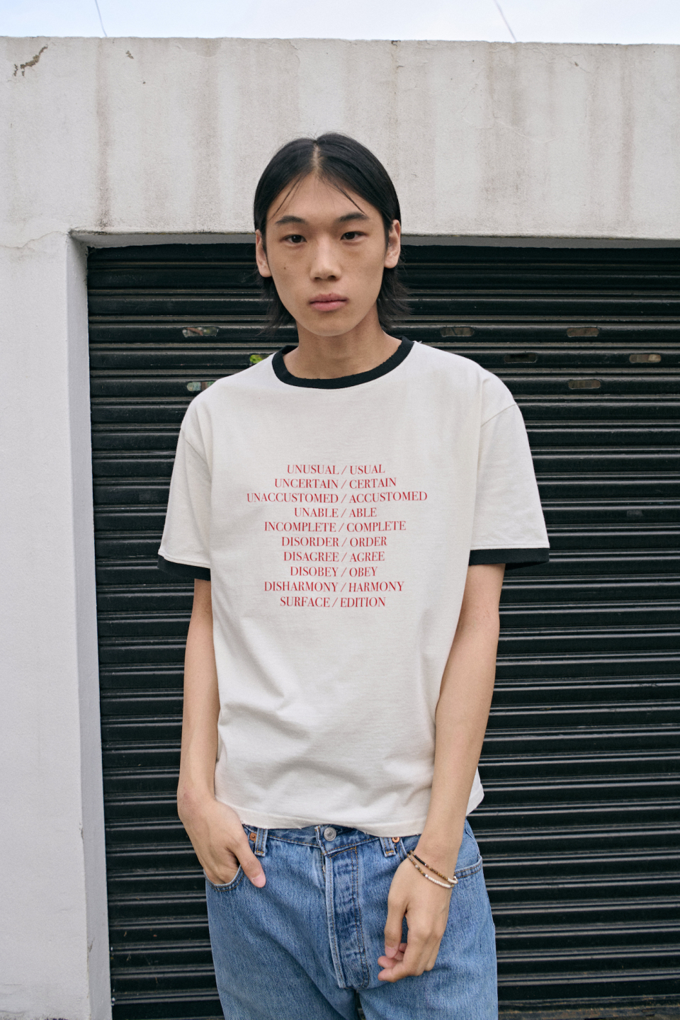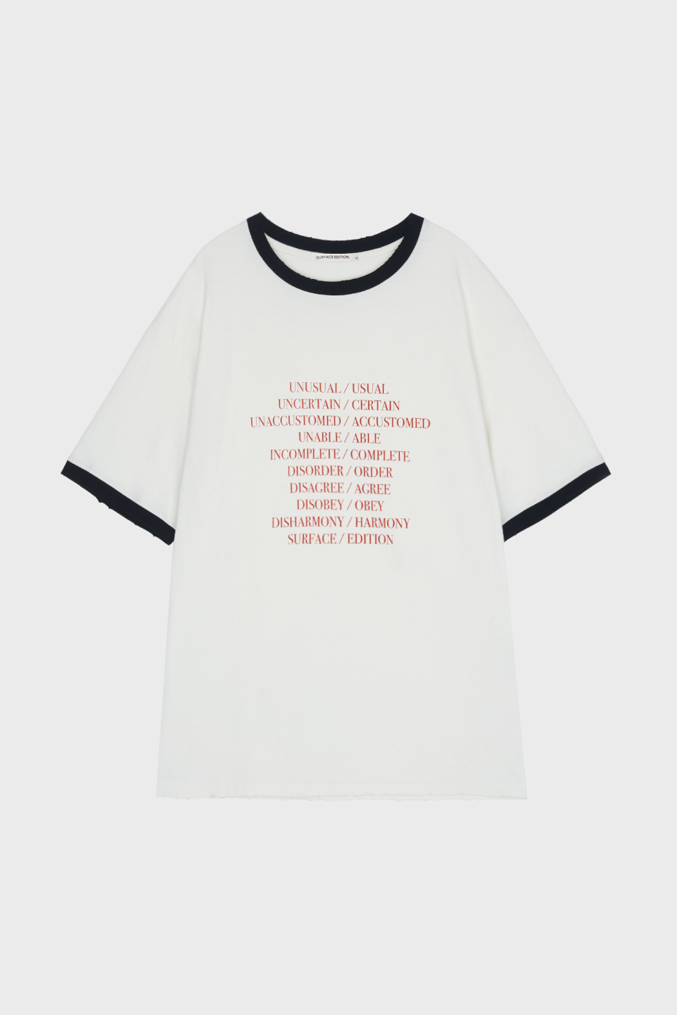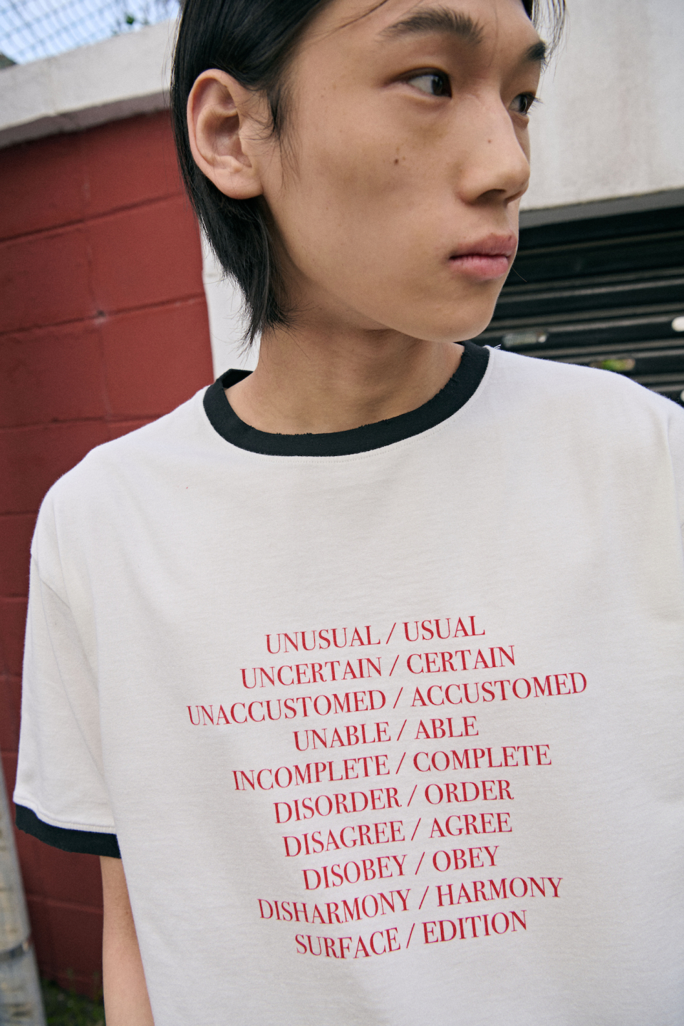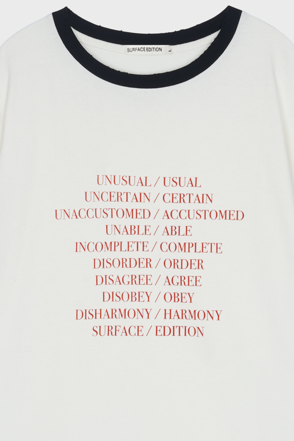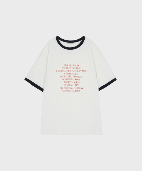 - 상반된 단어들 사이에서 주는 긴장감과 양면성을 표현하는 타이포그래피 링거티셔츠