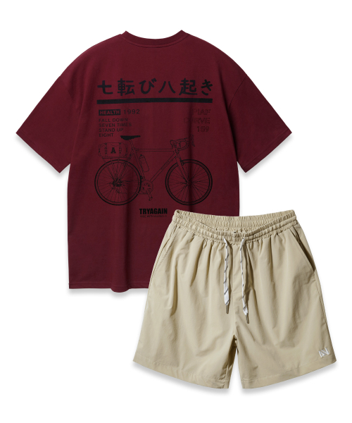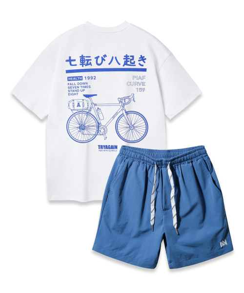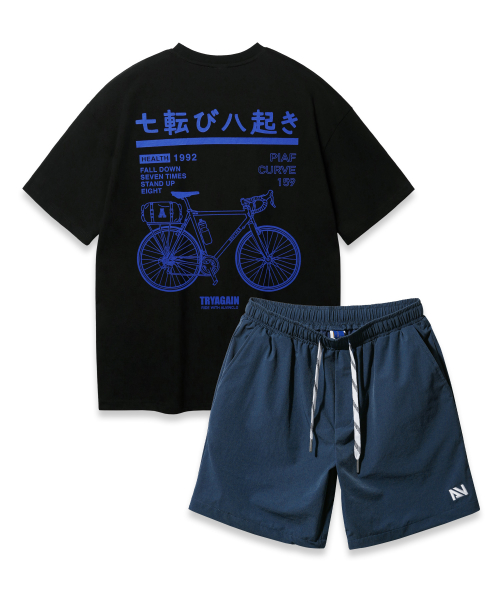 [SET] 바이시클 오버핏 반팔티 스트링 포인트 우븐 반바지 셋업