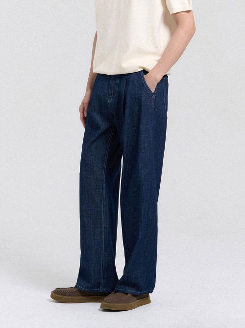 린넨 라이크 루즈 테이퍼드 밴딩 데님 팬츠 [딥 인디고]