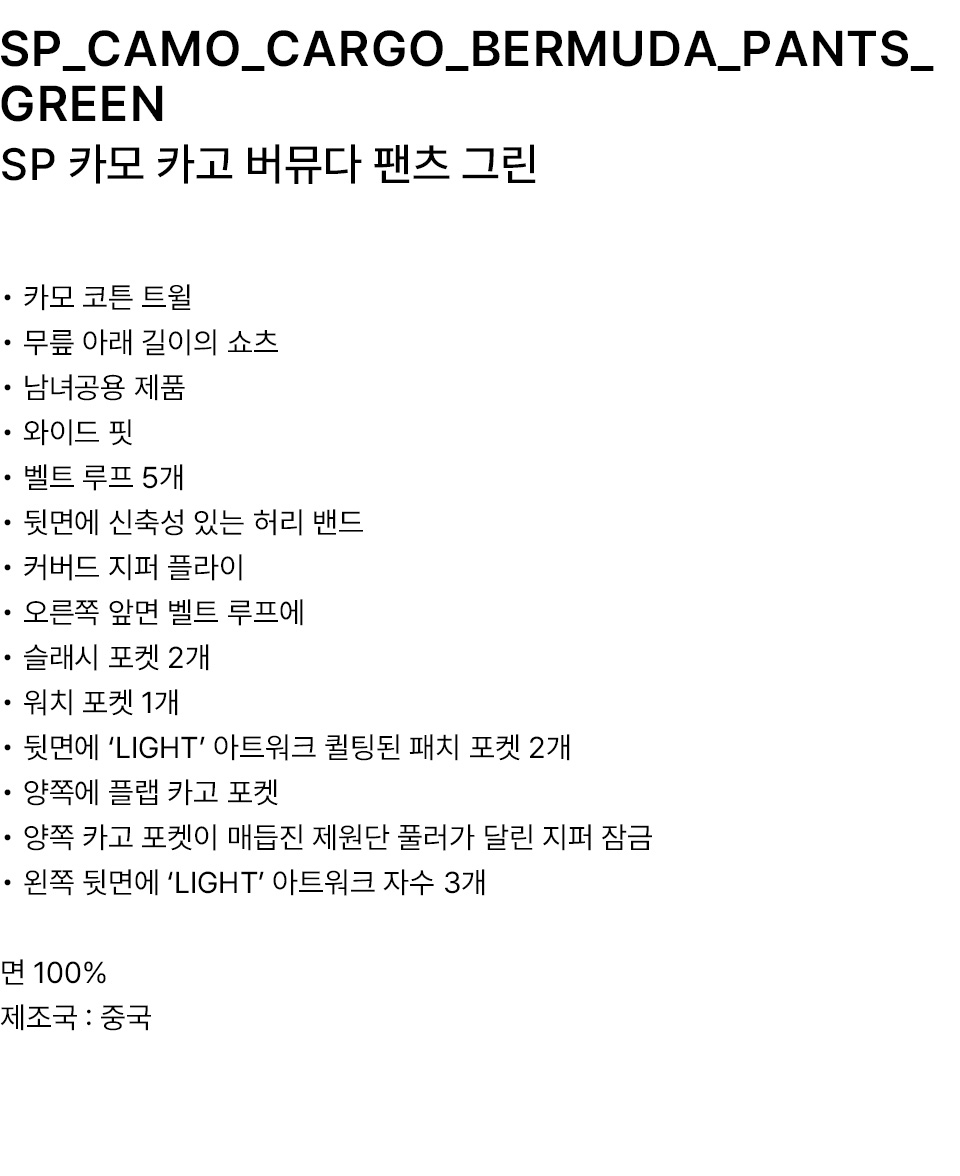 SP 카모 카고 버뮤다 팬츠 그린