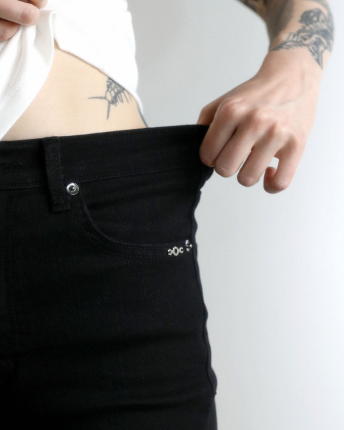 - 좌측 주머니에 금속 트라이클립스 라벨 장식
