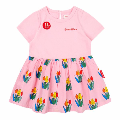 베베드피노 올 오버 튤립 베이비 리본 드레스입니다. 사랑스러운 Pink 컬러의 신축성이 뛰어난 Cotton span 소재에 이번 시즌 25SS 오브제인 Tulips 그래픽을 롤 프린팅하여 제작했습니다. 상의는 부드럽게 몸에 붙고, 스커트 부분은 A라인 실루엣으로 떨어지는 귀여운 드레스입니다. 정면에는 Bebedepino만의 B와펜과 로고 자수를 디자인하여 포인트를 더했습니다. 뒤판 허리 부분에는 리본을 달아 주어 러블리한 디자인을 연출하였습니다. 뒤 중심에 트임을 준 후 단추 잠금 처리하여 아이들이 입고 벗기에 용이합니다.