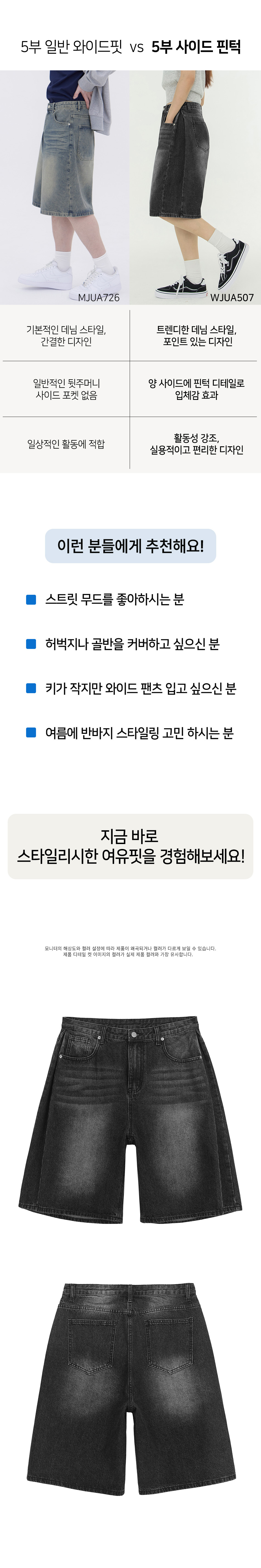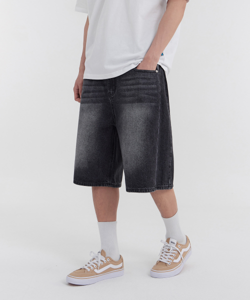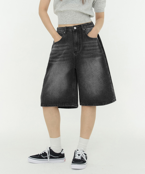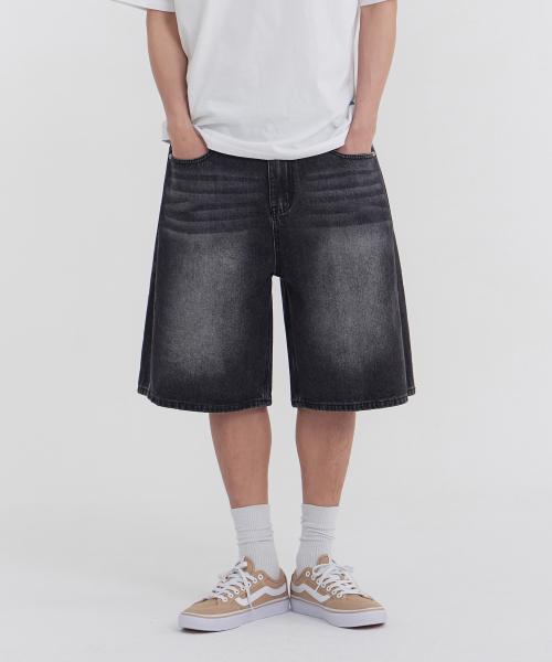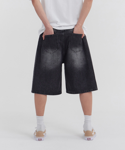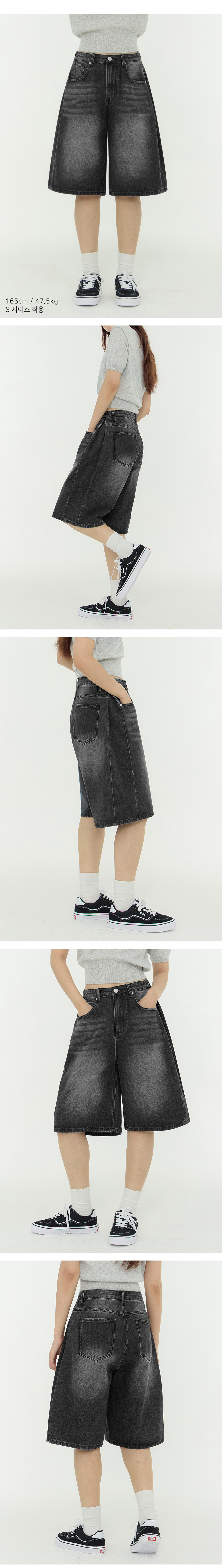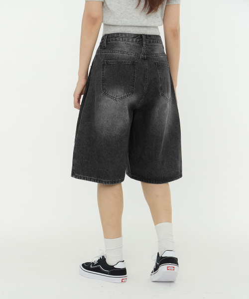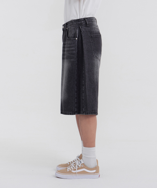 사이드 핀턱 와이드 5부 하프데님 팬츠 유니섹스 (블랙)