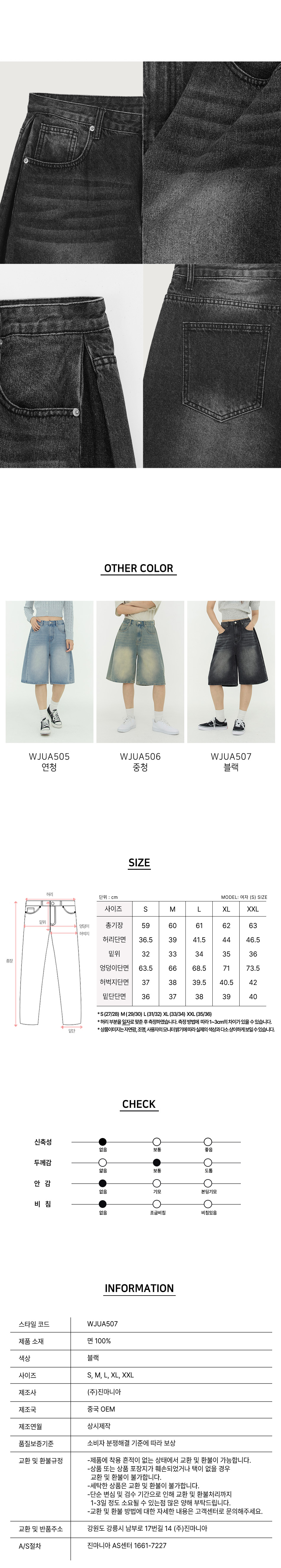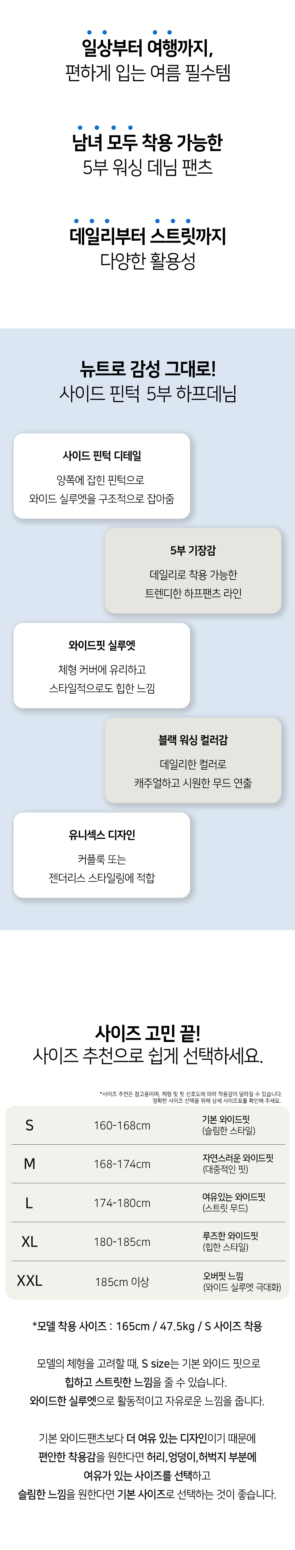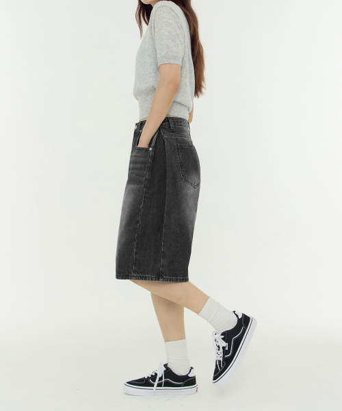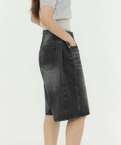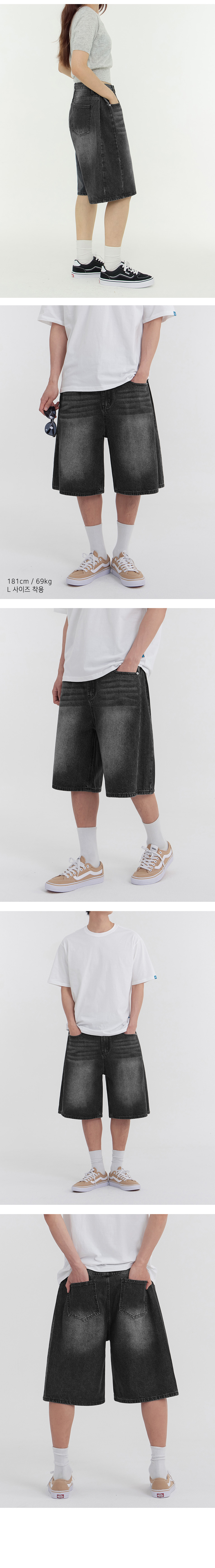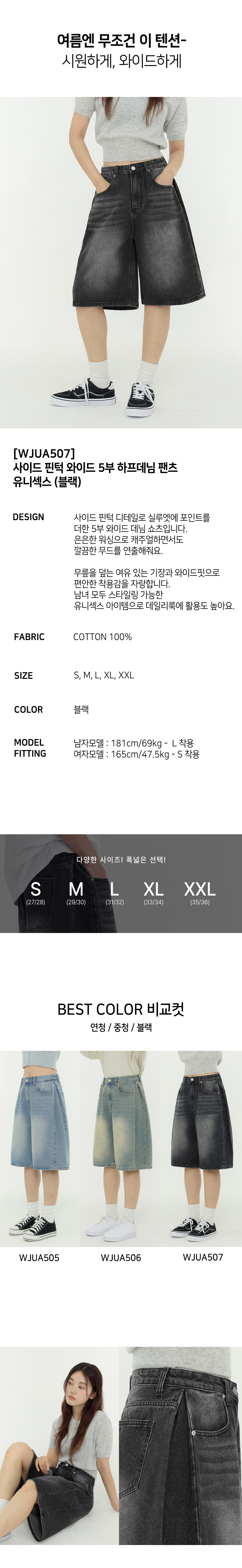 사이드 핀턱 와이드 5부 하프데님 팬츠 유니섹스 (블랙)