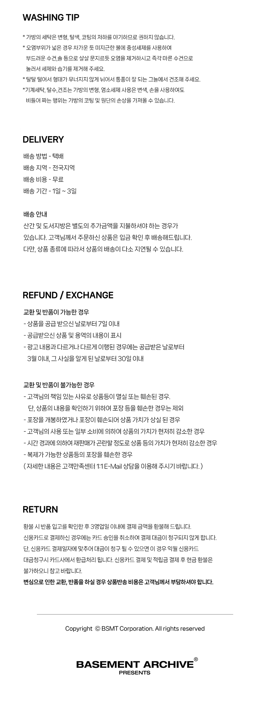 베이스먼트 아카이브(BSMT)는 어번 컨템포러리에 기반한 스트릿 문화와 시대정신을 재해석하여 매 시즌 새로운 아이템을 전개합니다. 기본에 충실하면서도 현재의 시대적 요구를 제품에 담아내기 위해 노력합니다.