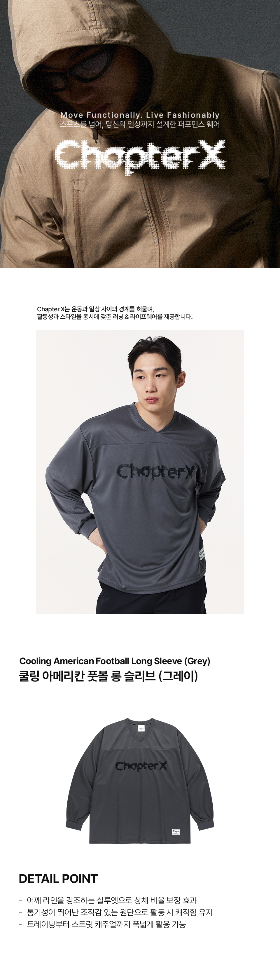 챕터엑스(CHAPTER.X)는 운동과 일상 사이의 경계를 허물며 활동성과 스타일을 동시에 갖춘 러닝, 라이프웨어를 제공합니다. 러닝과 퍼포먼스에 최적화된 기능성을 갖추면서도, 도심 속에서도 부담 없이 착용할 수 있는 스타일을 지향합니다.