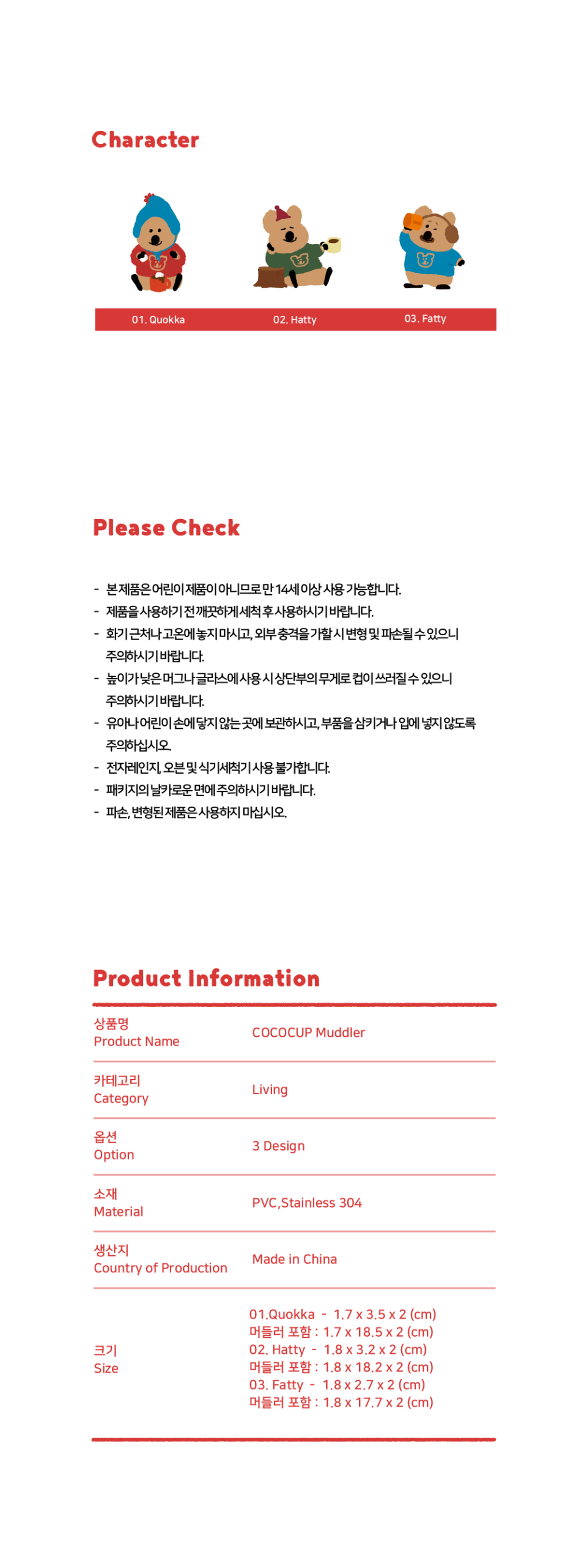 쿼카,해티,패티의 모습을 담아 머들러로 제작했습니다.