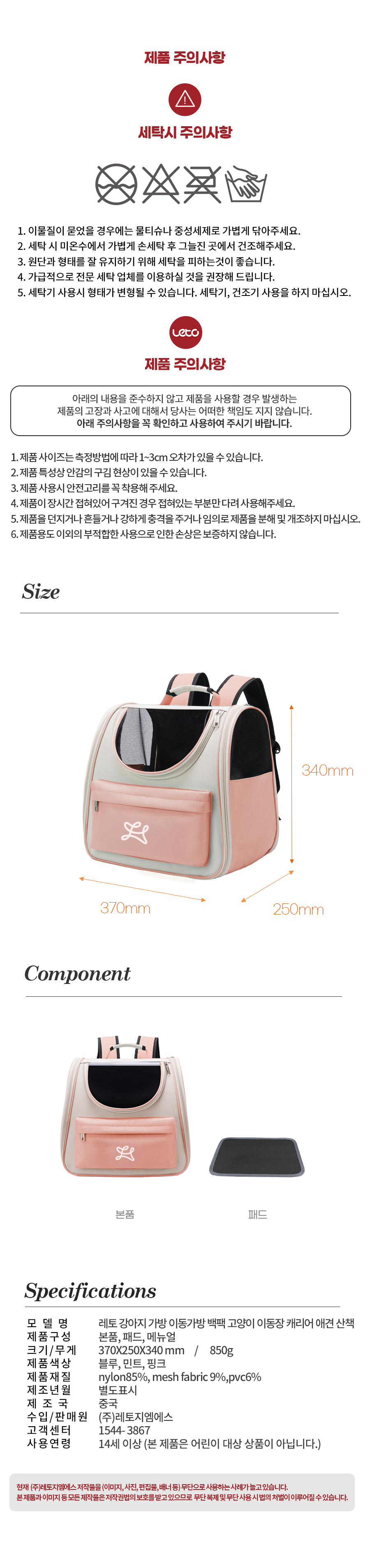 3가지 색상 강아지/고양이 백팩 이동가방