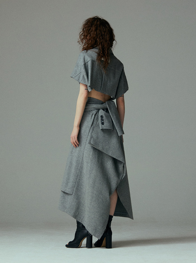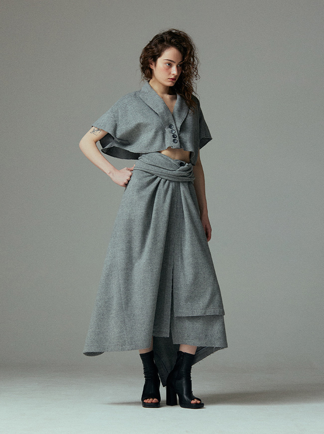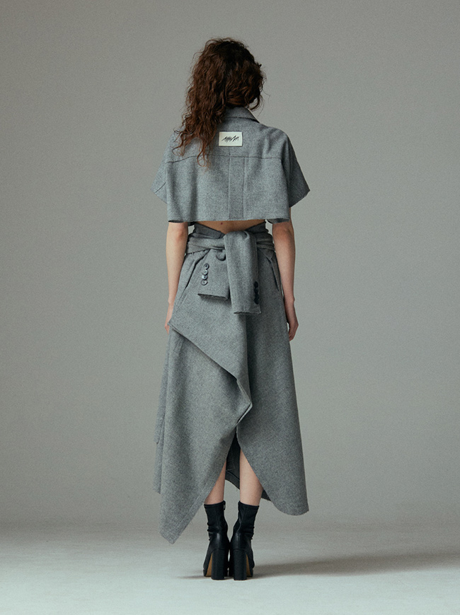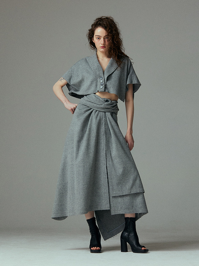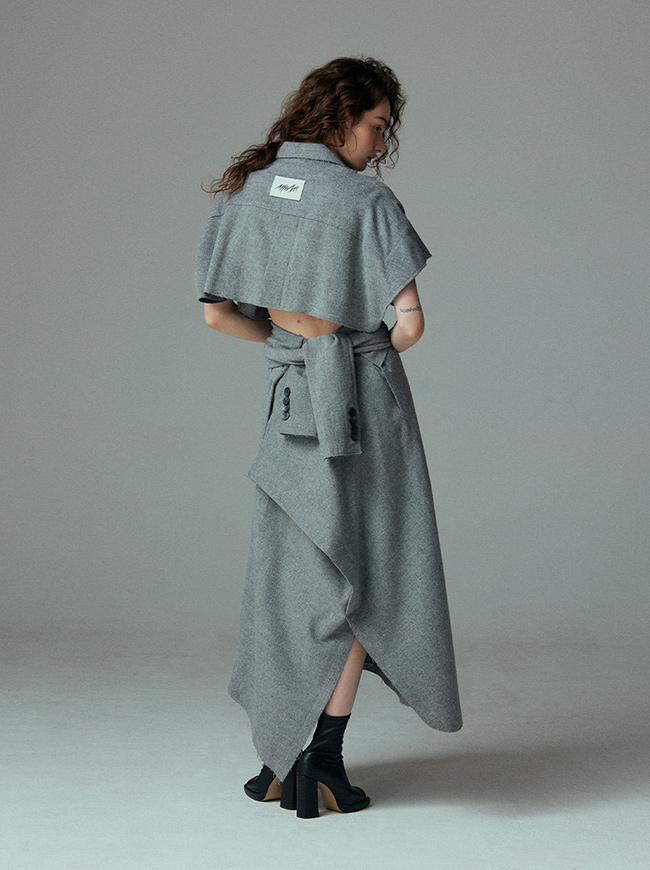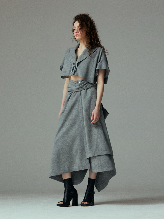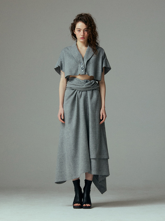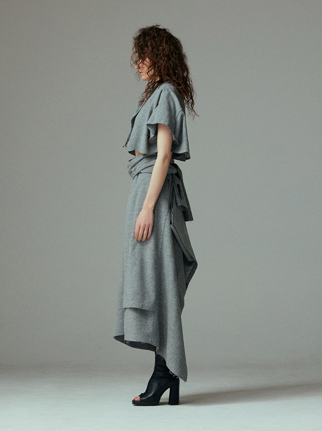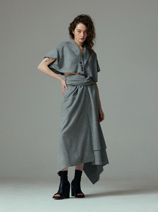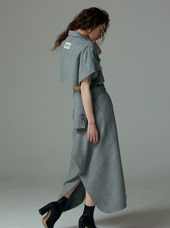 - 언발란스한 스커트 밑단과 러프하게 컷팅된 허리라인 실루엣