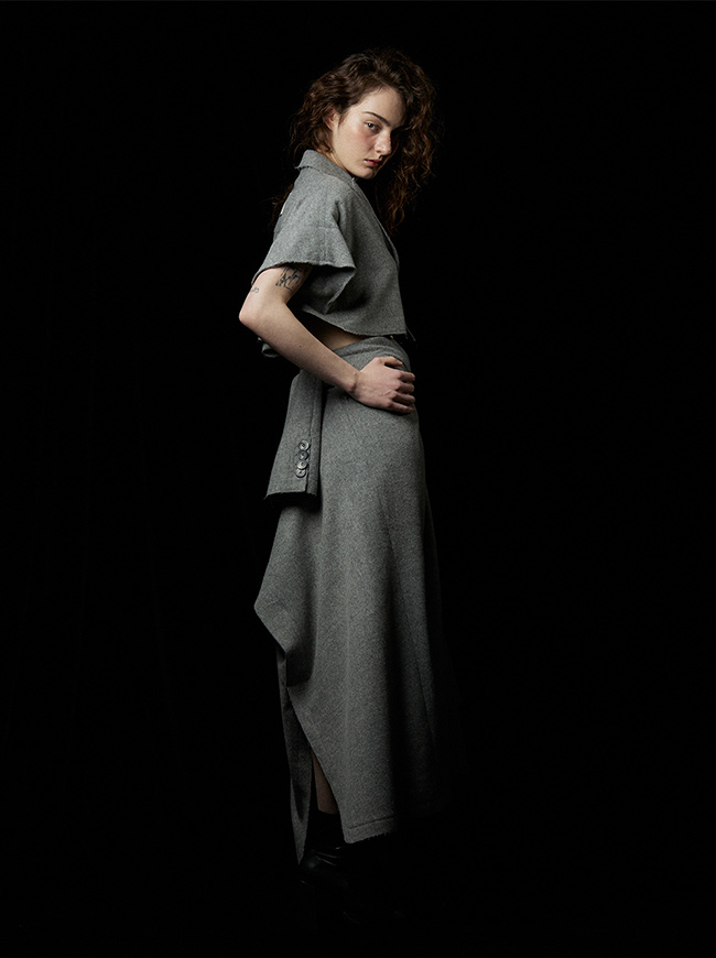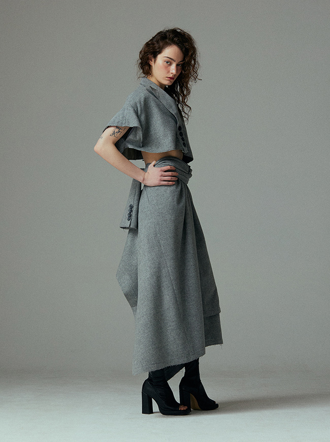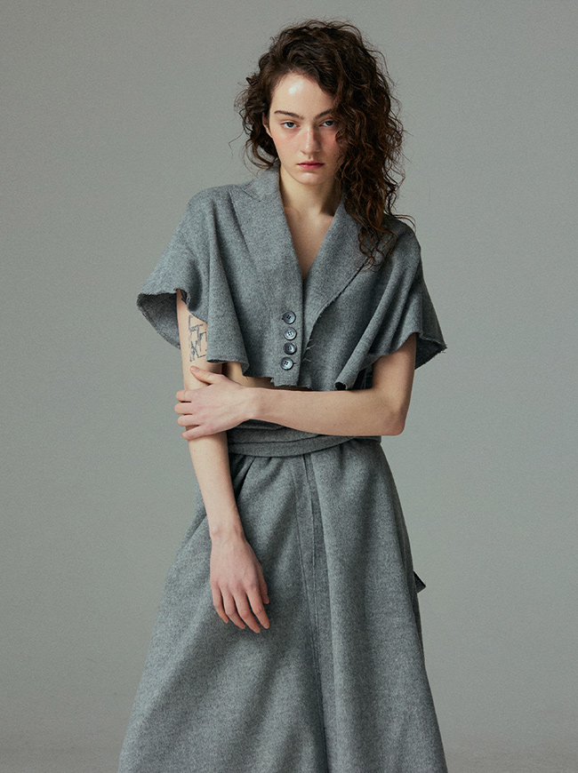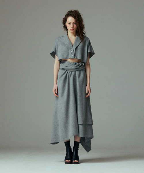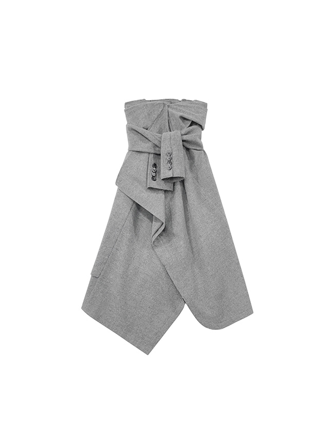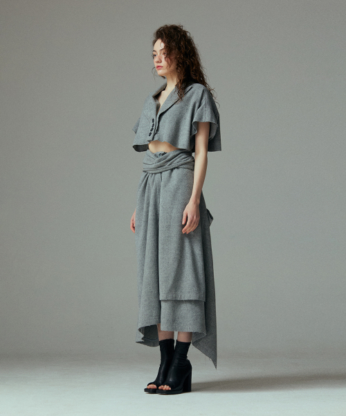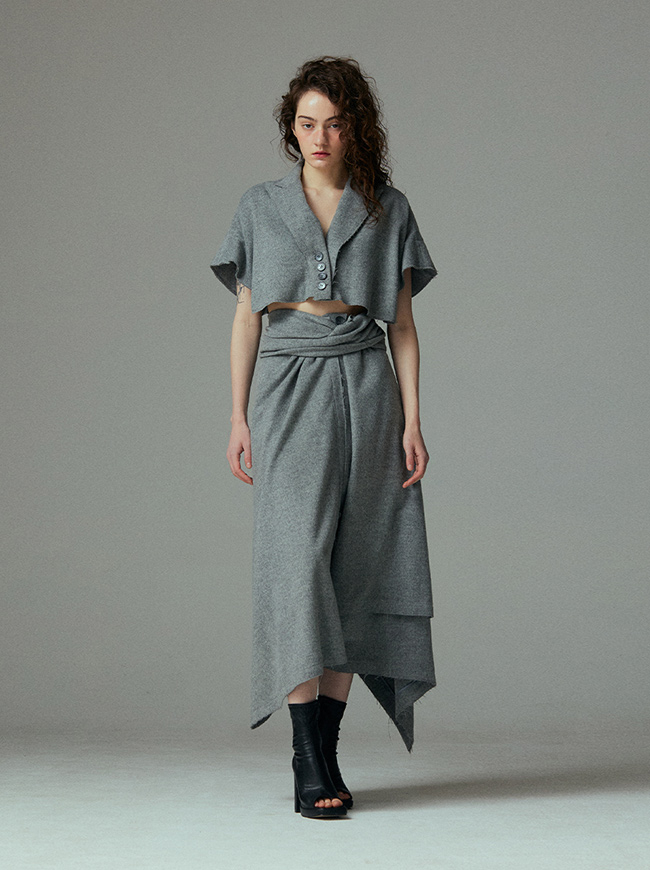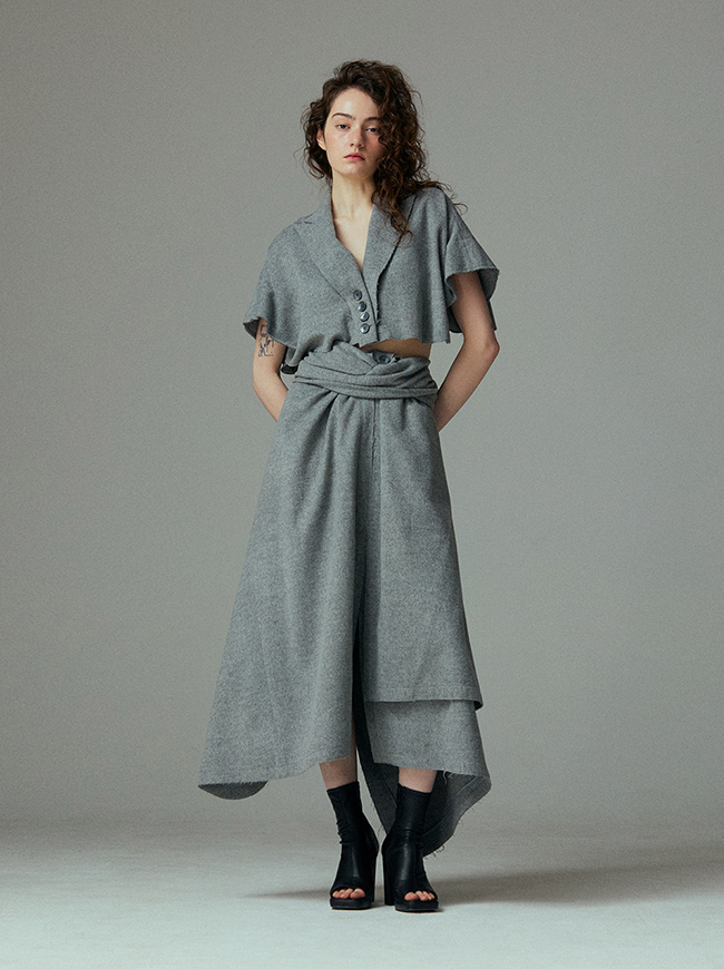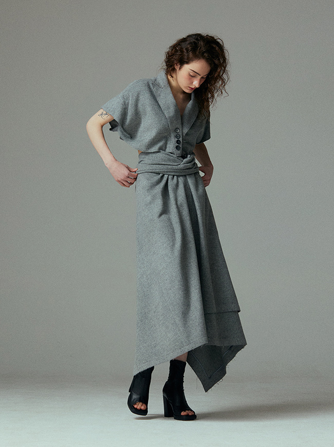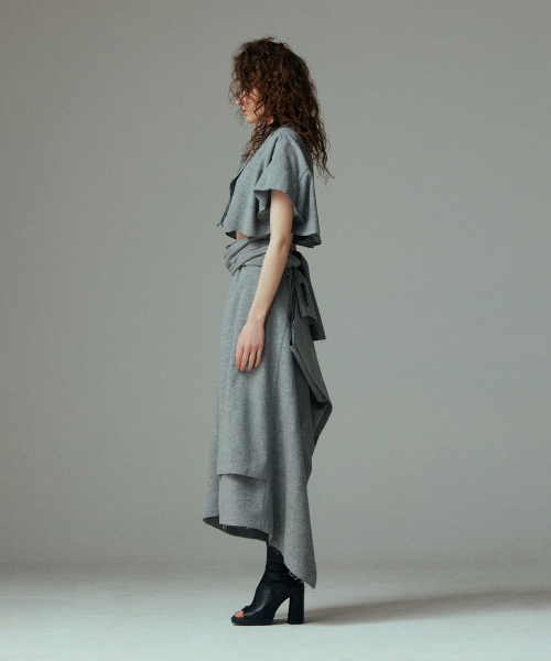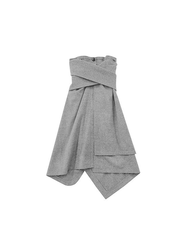 - 언발란스한 스커트 밑단과 러프하게 컷팅된 허리라인 실루엣