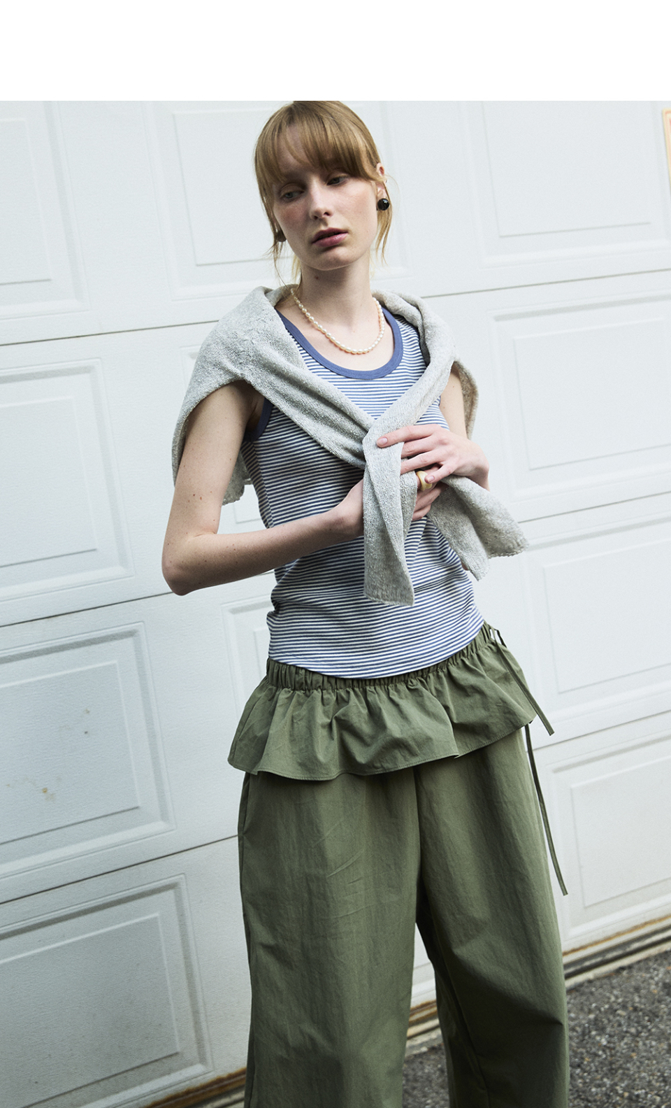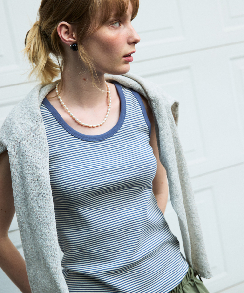 빈티지한 스트라이프 패턴과 섬세한 골지 조직 위로 얇은 스트라이프 패턴이 들어간 캐주얼 슬리브리스입니다.