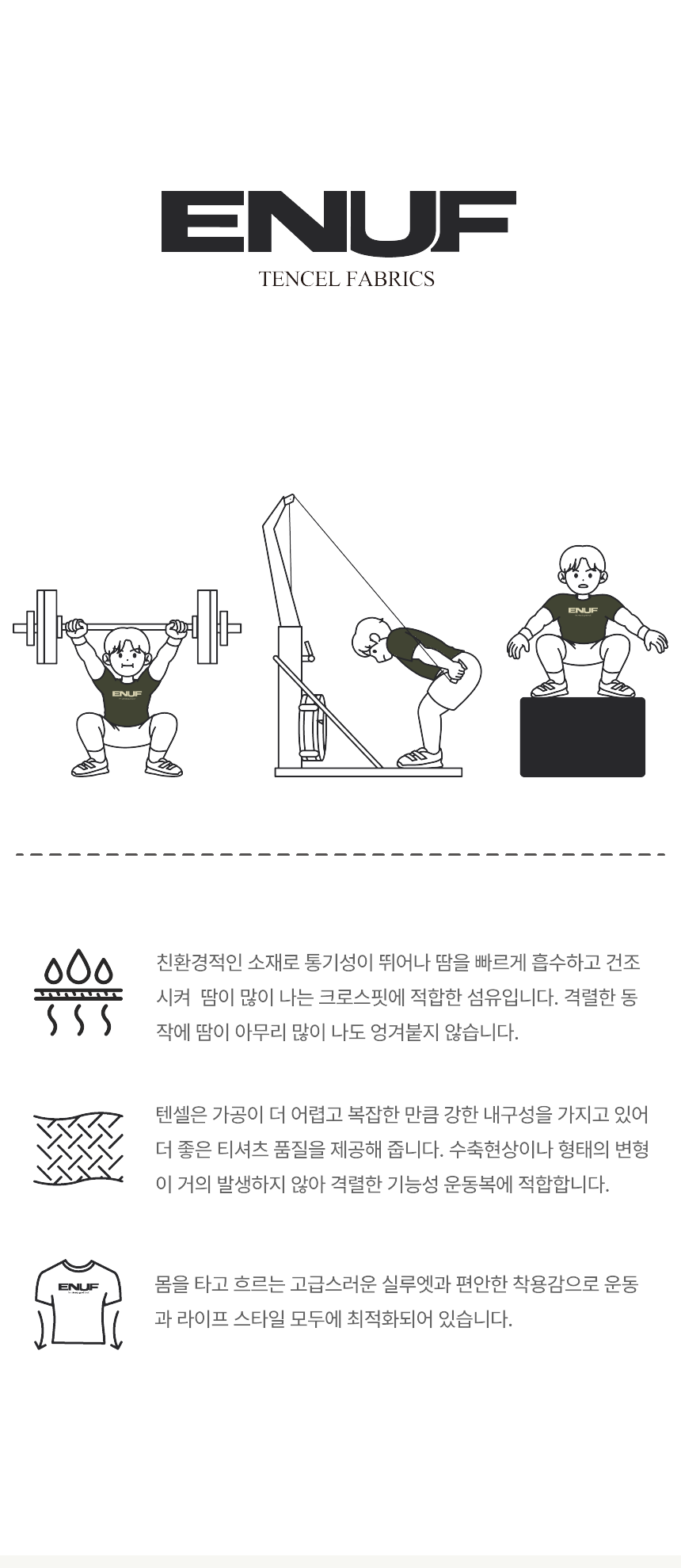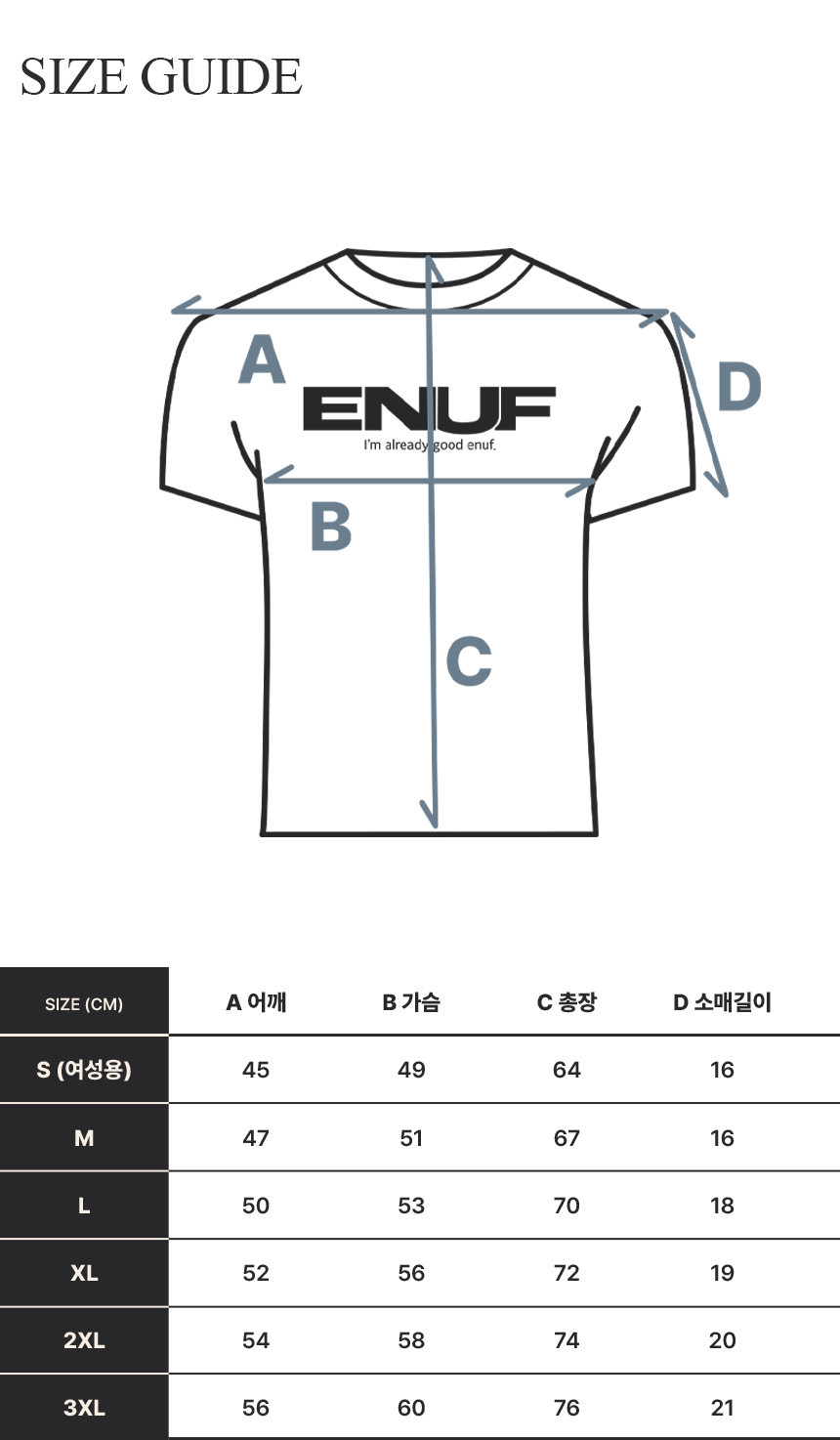 이너프(ENUF)는 '난 이미 충분해', '난 이미 잘하고 있는데?'라는 뜻으로, 자신감과 쿨함을 표현하고자 하는 슬로건의 브랜드입니다.
