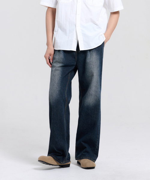 오너 하프밴딩 원턱 와이드 워싱 데님 팬츠 (Dark Blue)