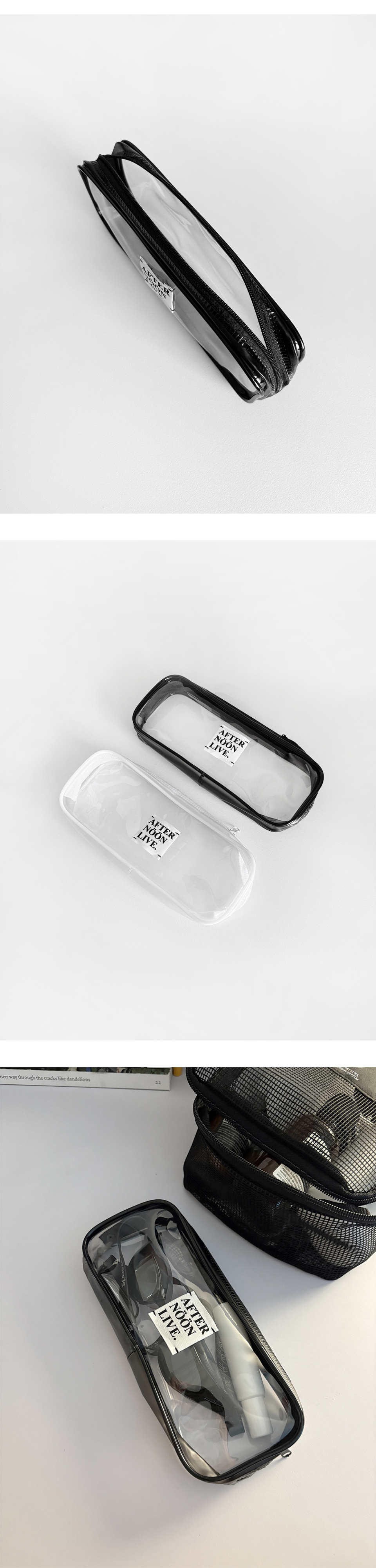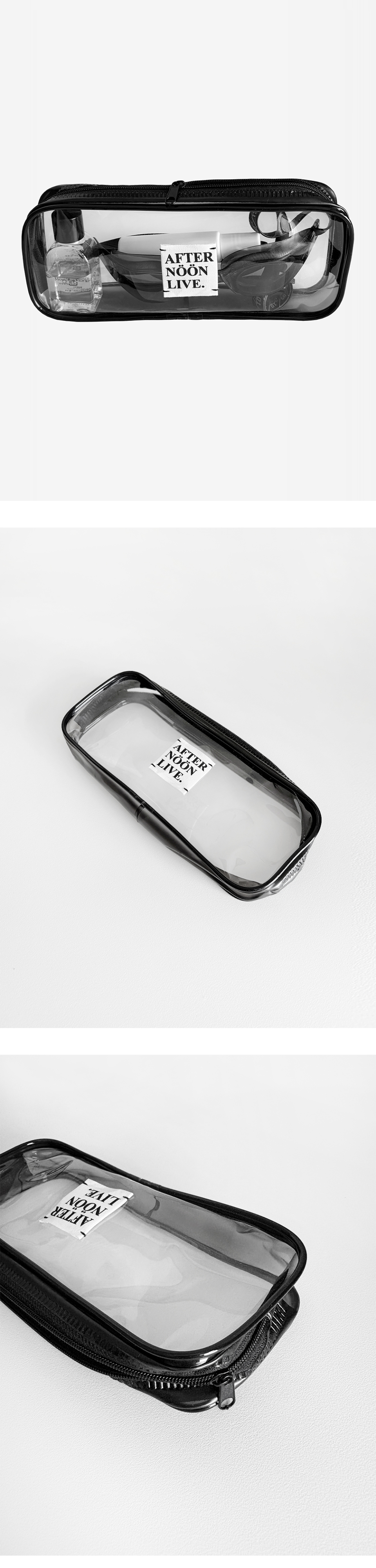 애프터눈라이브의 PVC 파우치입니다. 투명 커버로 파우치 속 소지품을 확인하기 편리하며 여름 시즌 바캉스에 함께하기 좋은 제품입니다. W20.5 X H8 X D4 (cm) 100% PVC