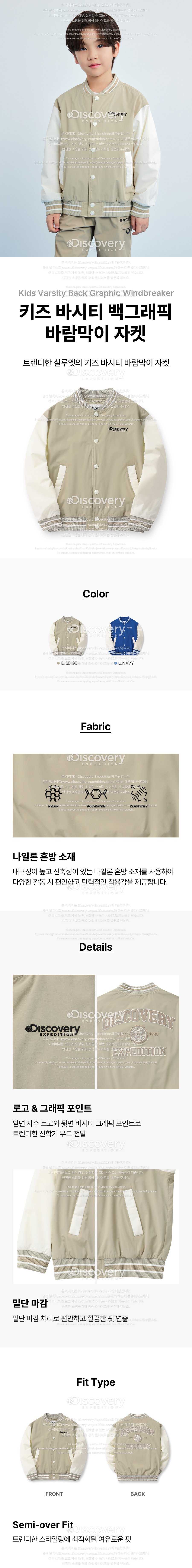 컬러 : D/BEIGE 상품코드: DKWJ11041-BGD 상품명: 키즈 바시티 그래픽(백) 바람막이 자켓 (D/BEIGE) (D/BEIGE) 소재: 겉감1 나일론100% 겉감2 폴리에스터100% 겉감3 폴리에스터98% 겉감3 폴리우레탄2% 안감 나일론100% 주머니감 폴리에스터100%