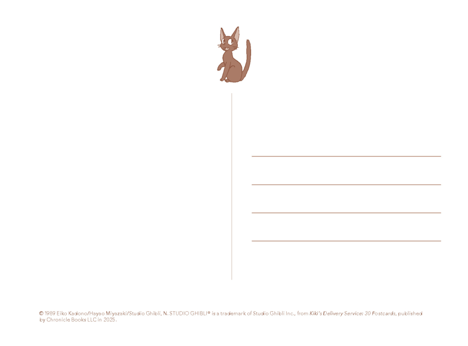 Take flight with Kiki, the resourceful young witch from Kiki’s Delivery Service, Studio Ghibli’s beloved fantasy film about a girl finding her way in the world. This collectible postcard set includes 30 different full-color images from the film. Featuring 30 final frames from the film--all hand-drawn and beautifully detailed--this postcard collection celebrates the artistry behind legendary director Hayao Miyazaki’s delightful coming-of-age story.
