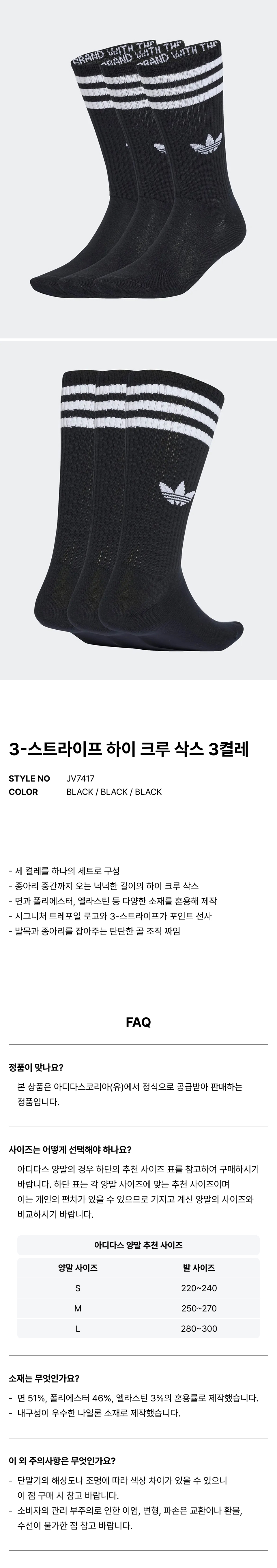3-스트라이프 하이 크루 삭스 3켤레 - 블랙 / JV7417