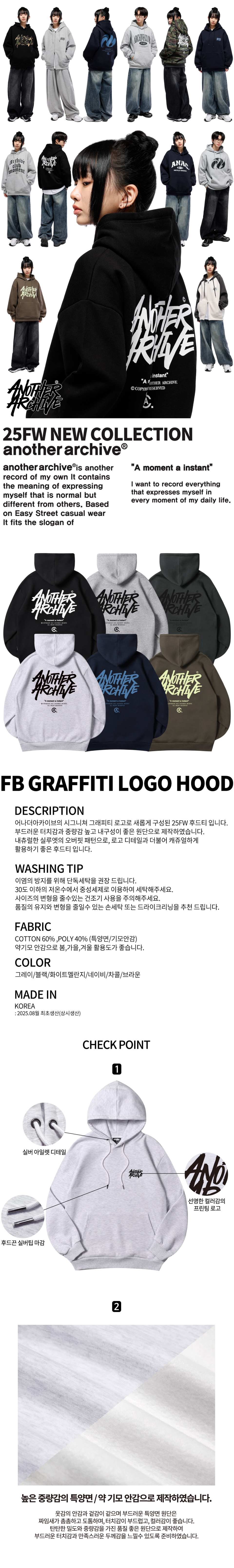 어나더 아카이브(ANOTHER ARCHIVE)는 또 다른 자신의 기록이라는, 평범하지만 남들과 다른 나를 표현하고자 하는 의미를 담고 있습니다. 이지 스트릿 캐주얼 웨어를 기반으로 'a moment a instant'라는 슬로건에 어울리는, 일상의 순간순간마다 나를 표현하는 모든 것을 기록하고자 합니다.
