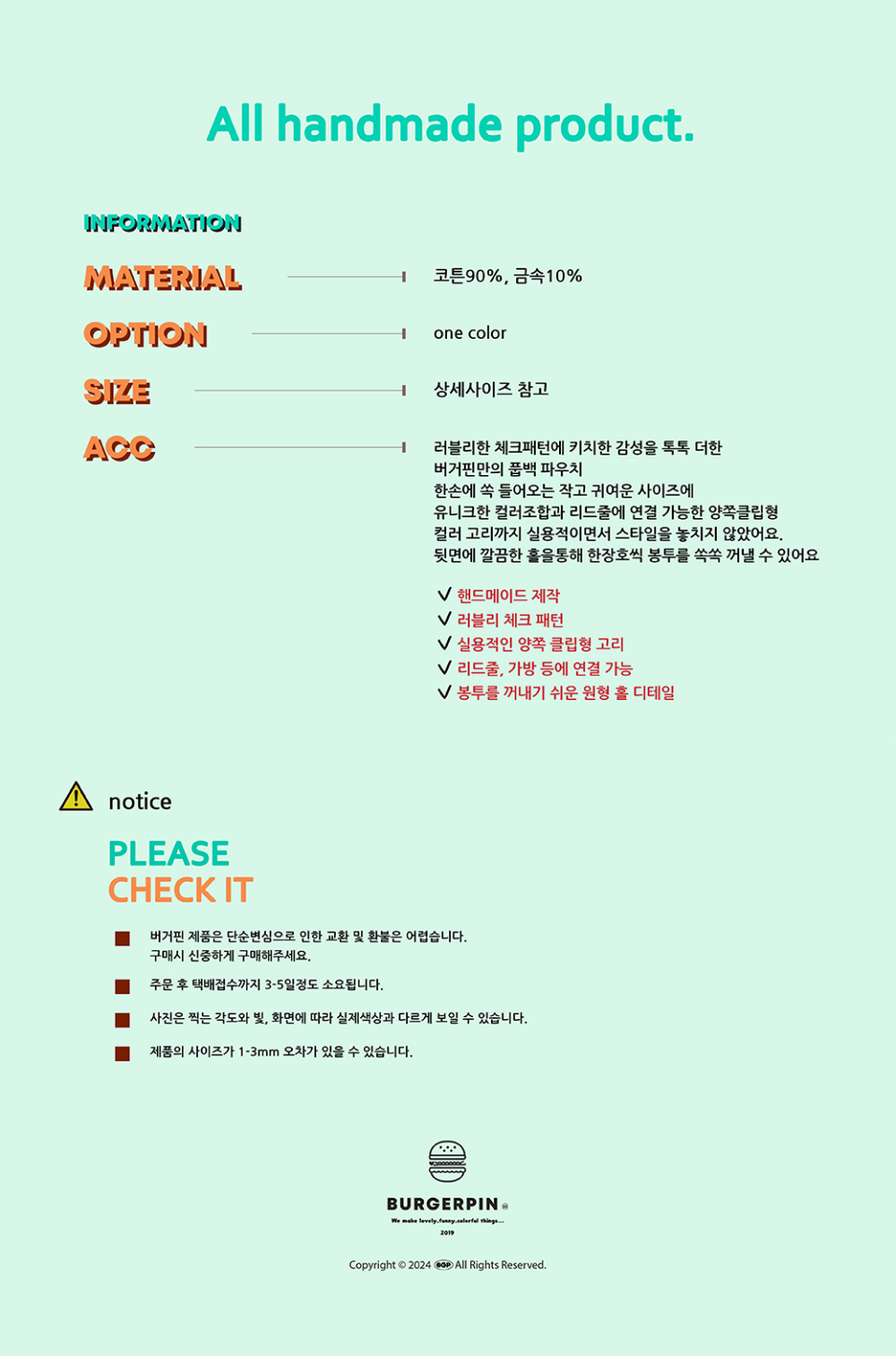 버거핀(BURGERPIN)은 러블리하고 퍼니한 일상 및 패션 소품과 디자인 아이템을 선보이는 브랜드입니다.