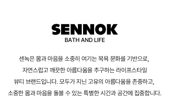 센녹(SENNOK)은 몸과 마음을 소중히 여기는 목욕 문화를 기반으로, 자연스럽고 깨끗한 아름다움을 추구하는 라이프스타일 뷰티 브랜드입니다.