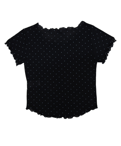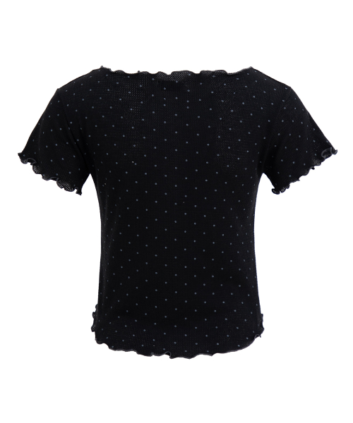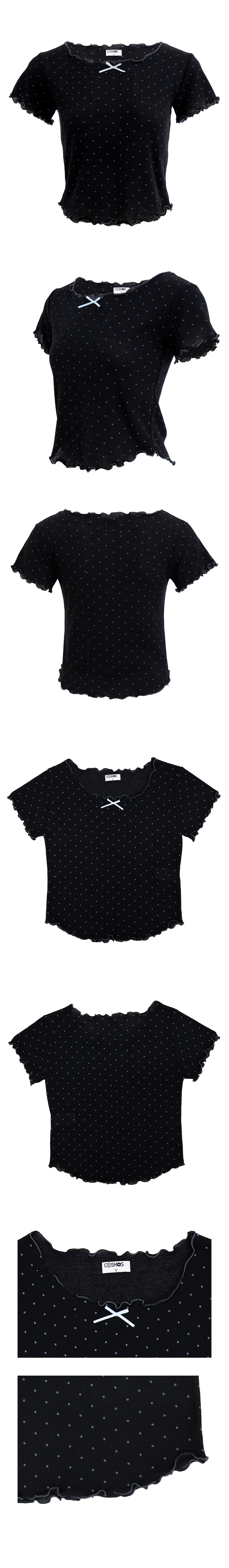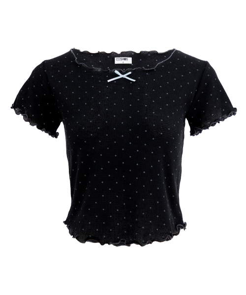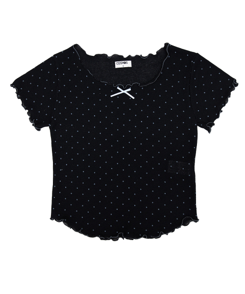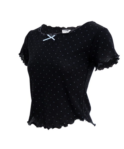 도트 반팔 티셔츠. 배색 리본장식과 날나리 마감을 가미.