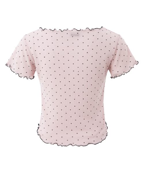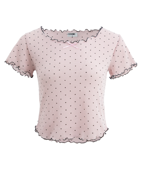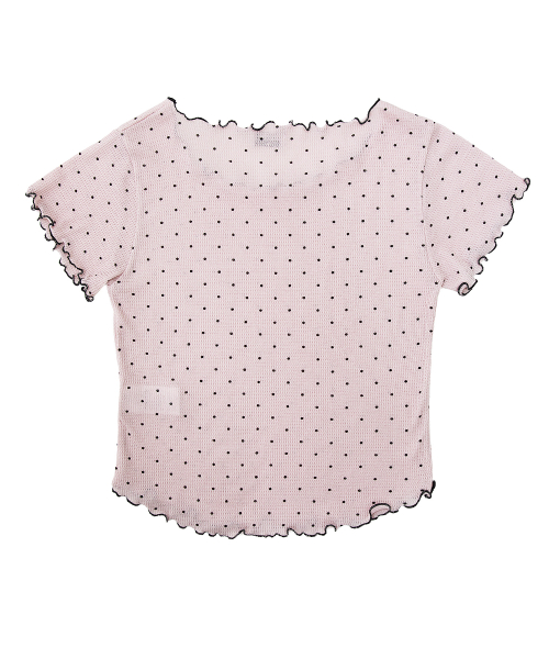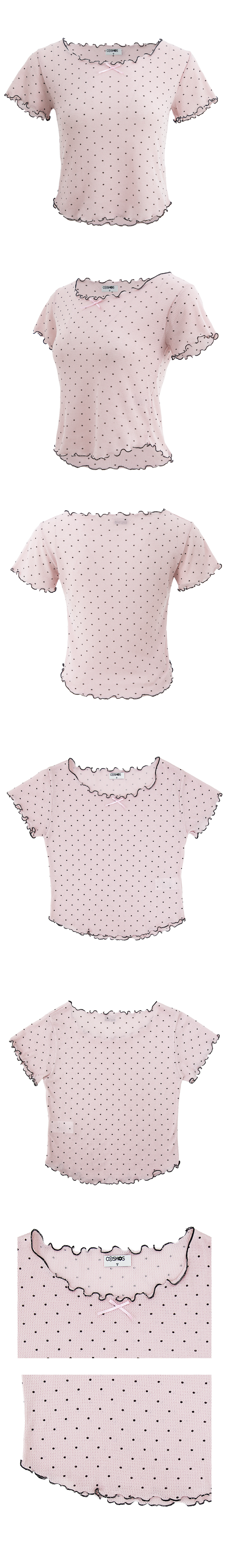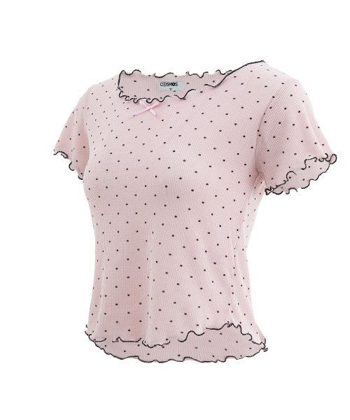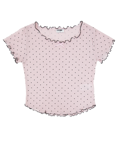 도트 반팔 티셔츠. 배색 리본장식과 날나리 마감을 가미.
