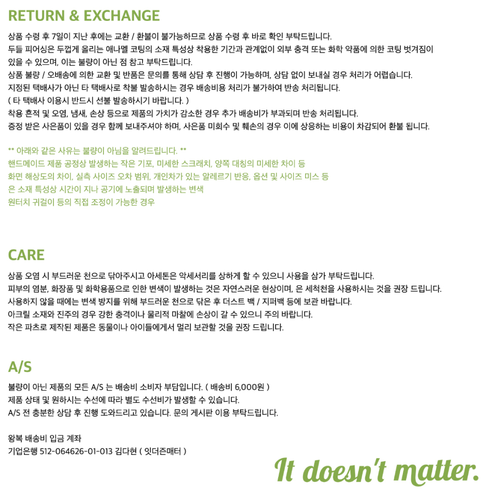 잇더즌매터(IT DOESN'T MATTER.)는 각자가 사랑하는 컬러에 집중합니다. 핸드 크래프트 제품으로 가볍고 사랑스럽게, 재치 있고 산뜻하게 일상에 컬러를 더하고자 합니다.