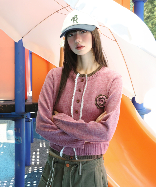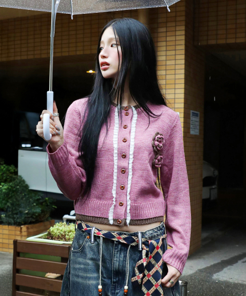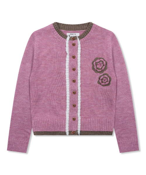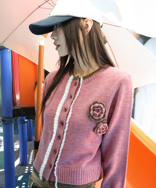 WXK023 복숭아 꽃 크로셰 배색 니트 가디건 (VINTAGE PINK)