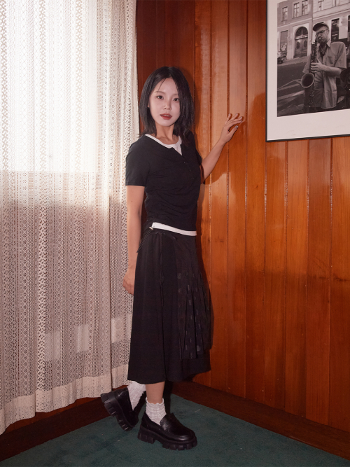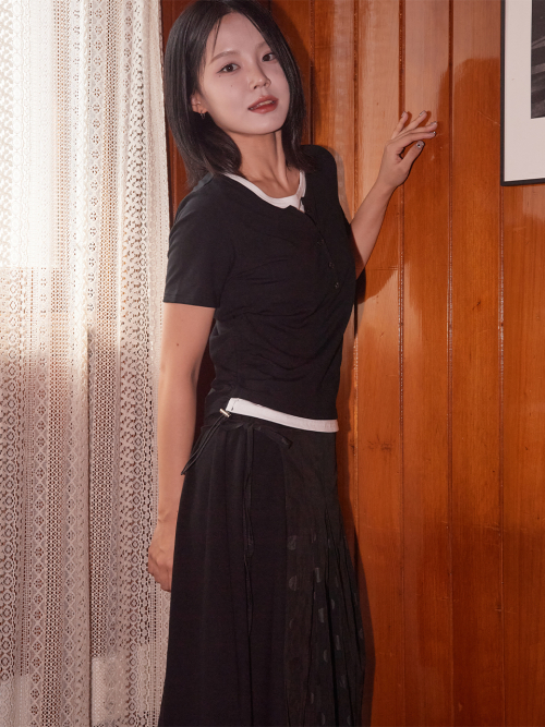888 플리츠 미디 스커트 레이어드 스냅 롤업 와이드 투피스 세트 [블랙]