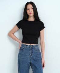 우먼즈 슬림 크롭 크루 넥 티셔츠 [블랙]