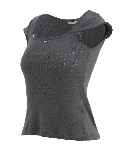 펀칭 티셔츠. 절개 캡소매 라인 디테일에 로고장식을 가미.