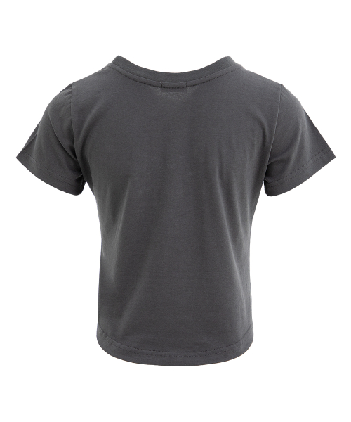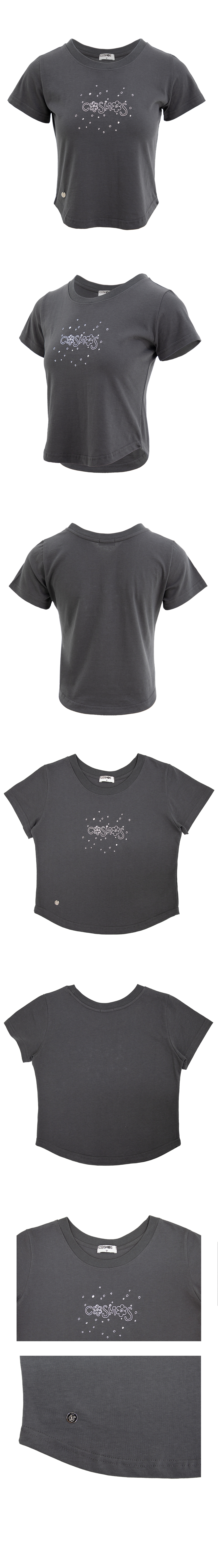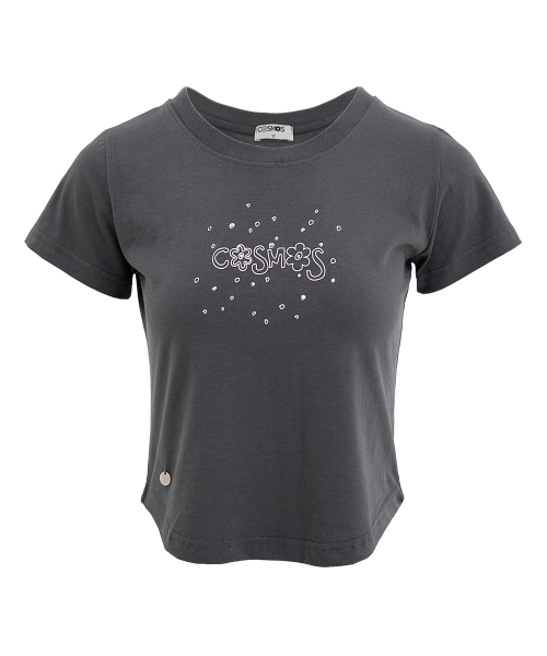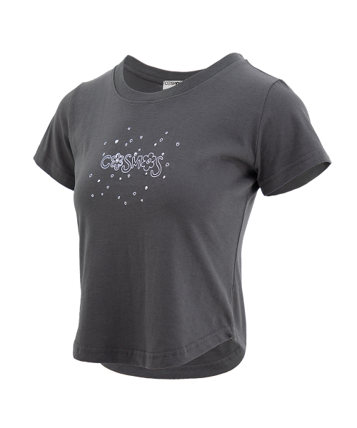 크롭 로고 티셔츠. 로고나염에 핫픽스와 장식을 가미.