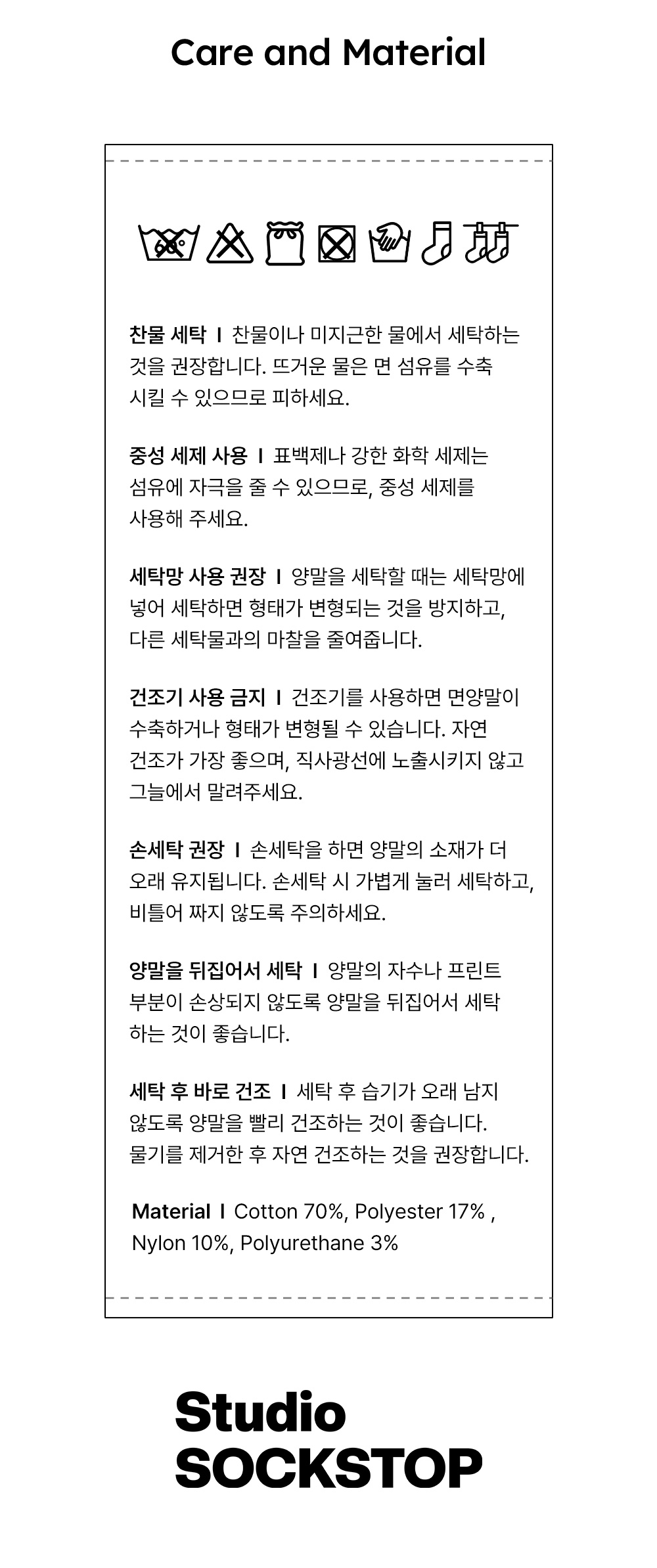 스튜디오 싹스탑(STUDIO SOCKSTOP)은 30년 이상의 역사를 가진 양말 브랜드로, 국내 생산만을 고집합니다.