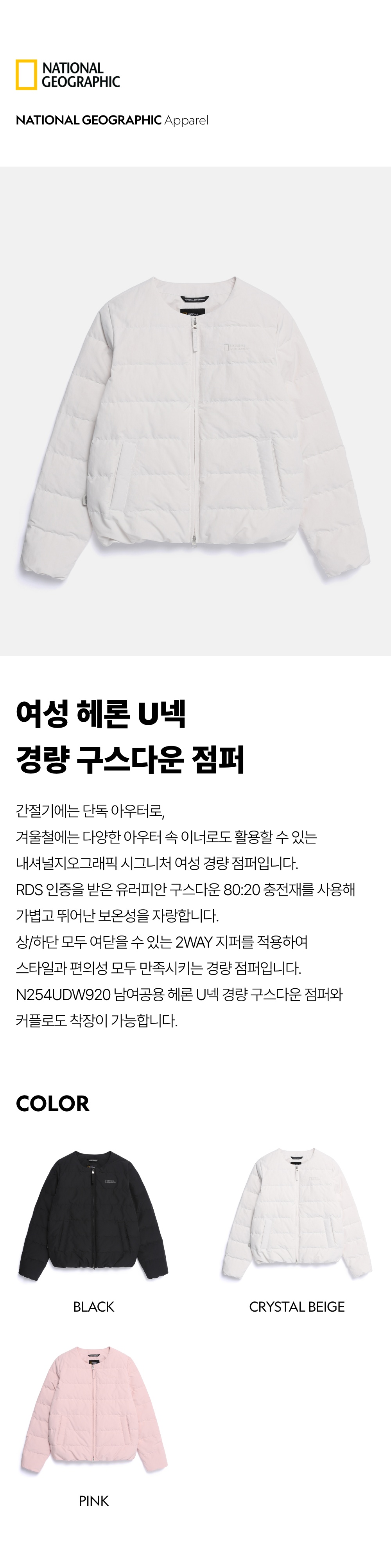 N254WDW920 여성 헤론 U넥 경량 구스다운 점퍼 CRYSTAL BEIGE