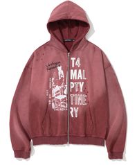 Distressed Half Slogans Hood Zip Up - Red