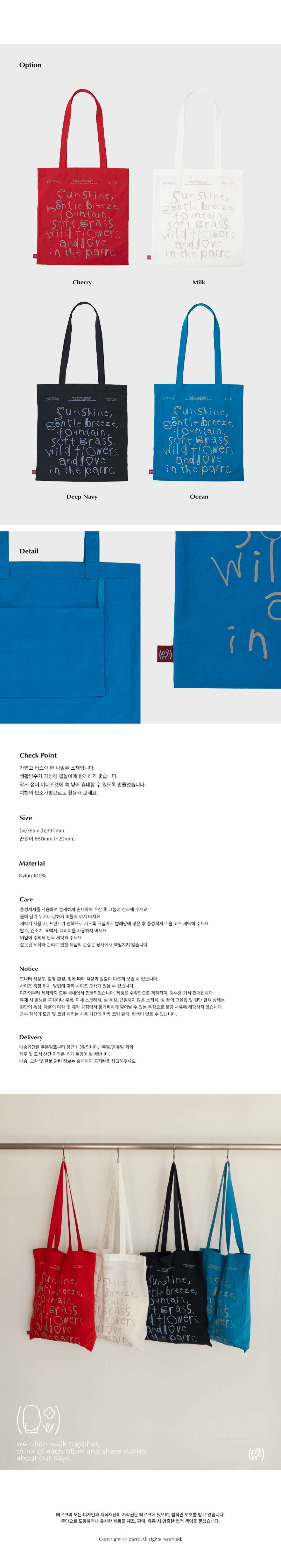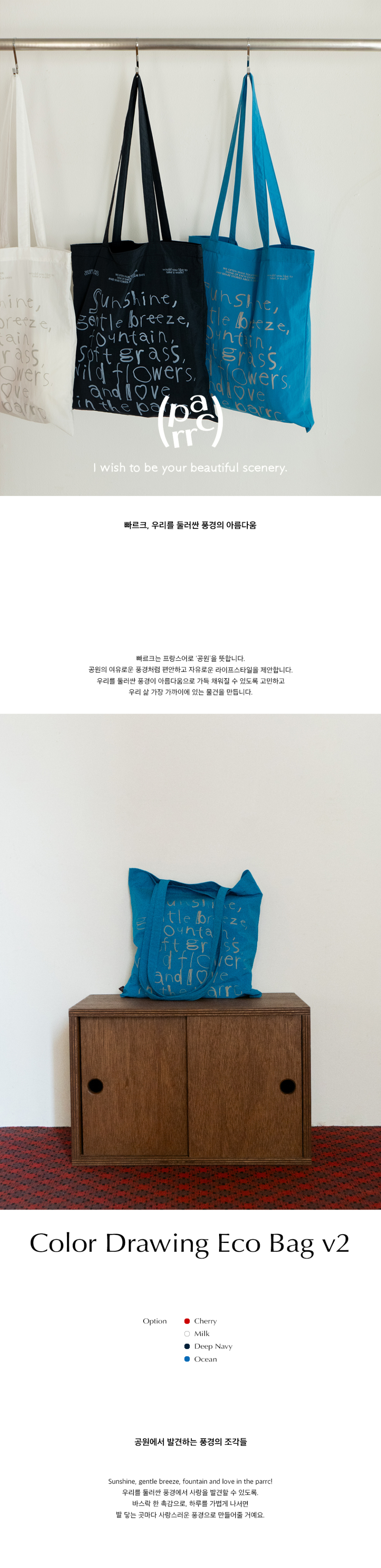 빠르크(PARRC)는 프랑스어로 '공원'을 뜻하며, 공원의 여유로운 풍경처럼 편안하고 자유로운 라이프 스타일을 제안하는 브랜드입니다. 도시와 자연, 계절과 사람을 바라보며 우리를 둘러싼 풍경이 아름다움으로 가득 채워질 수 있도록 고민하여 삶 가장 가까이에 있는 물건을 만듭니다.