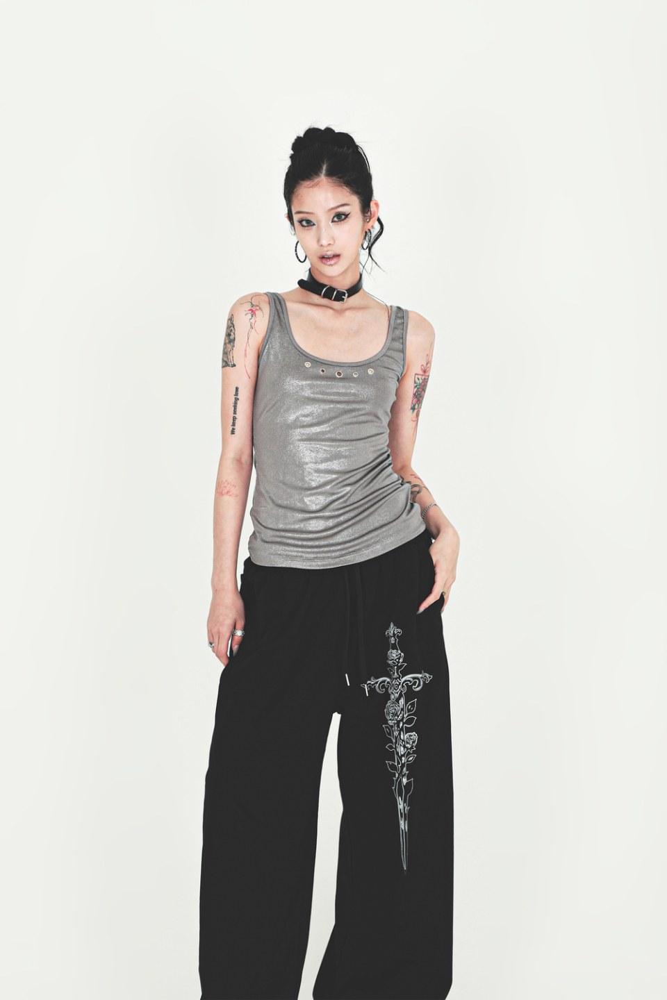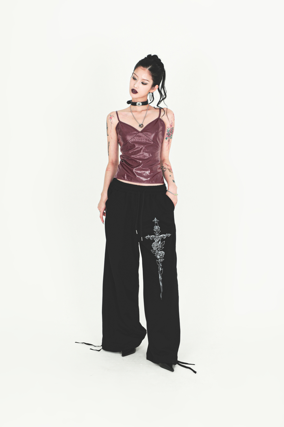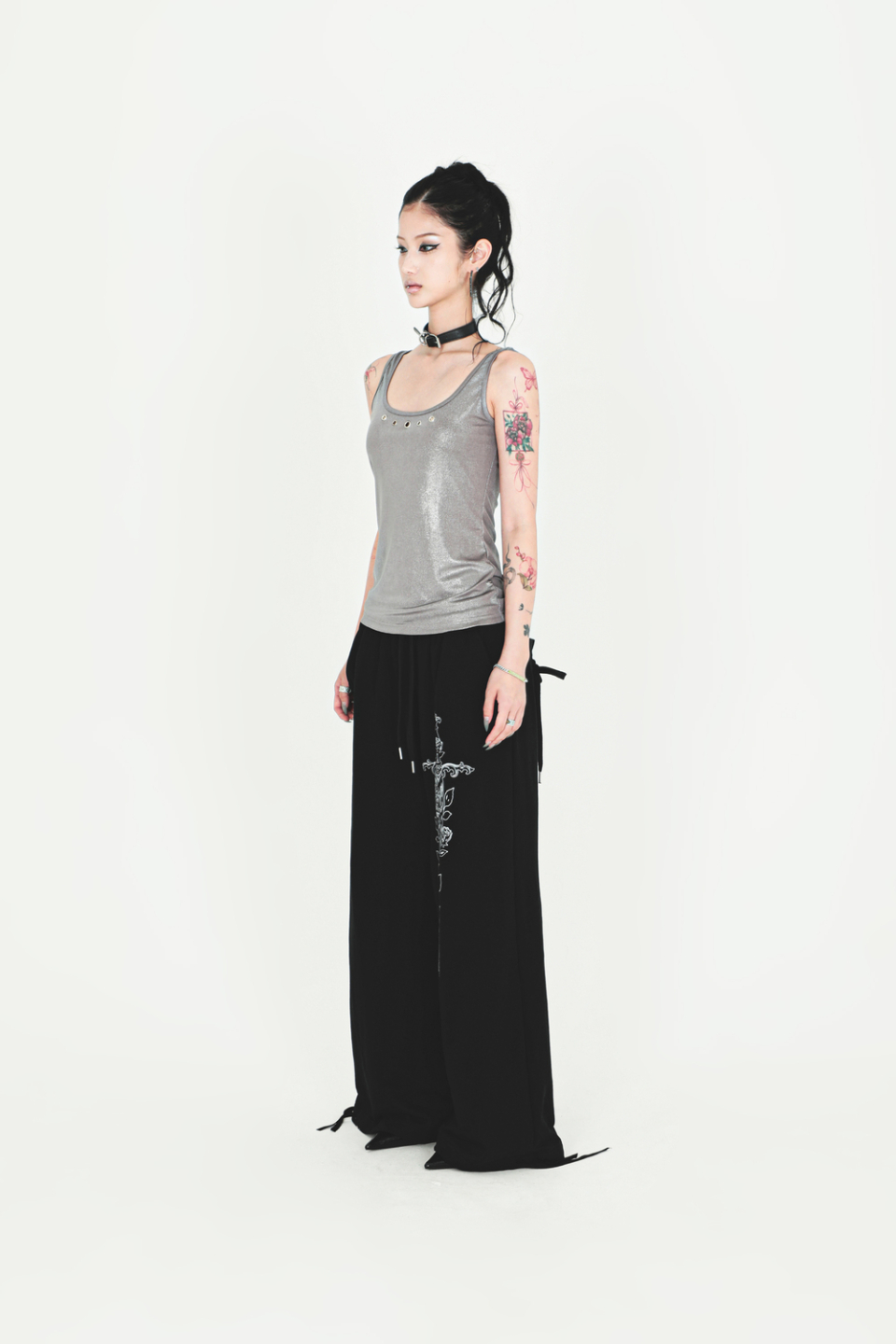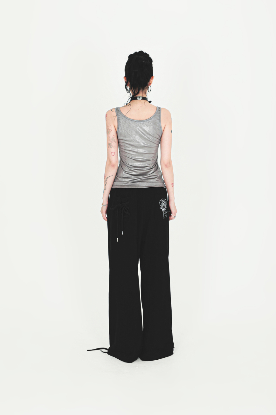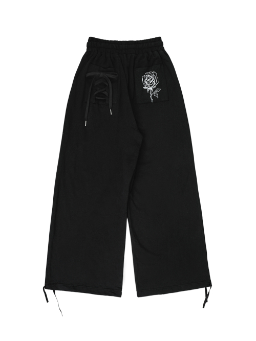 후면의 백 포켓 코르셋 디테일 & 로즈 아트워크 프린팅