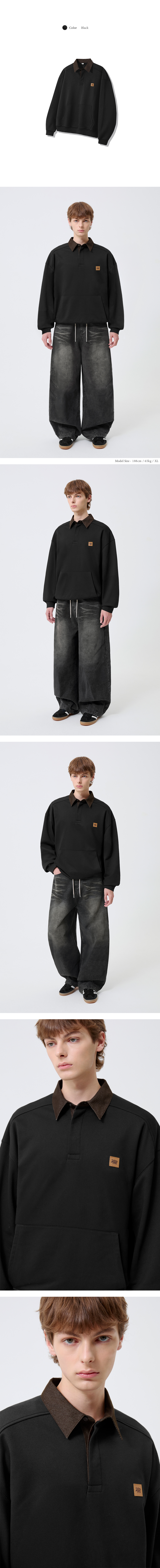 레더 패치 데님 카라 럭비 맨투맨_블랙
