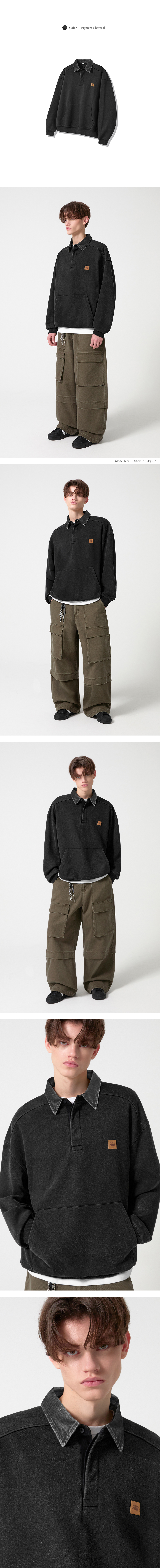 레더 패치 데님 카라 럭비 맨투맨_피그먼트 차콜