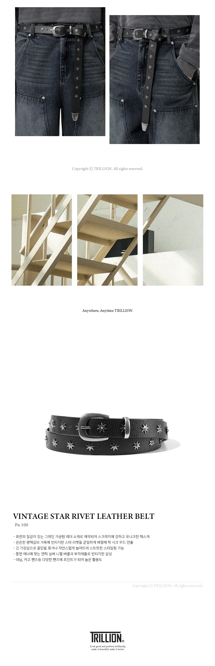 트릴리온(TRILLION)은 클래식, 빈티지, 아웃도어, 어반 등의 스타일을 베이스로 트릴리온만의 컨템포러리 감성을 더해 높은 퀄리티의 제품을 합리적인 가격에 제시합니다. 단 하나의 제품에도 만족감을 느낄 수 있는 가치를 추구합니다.