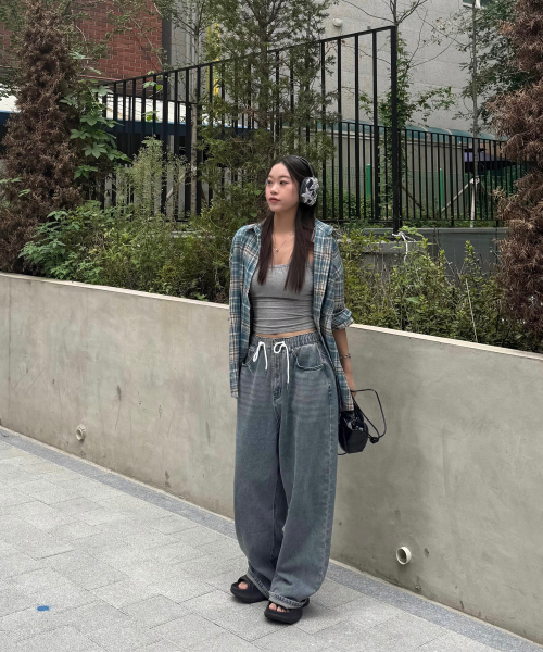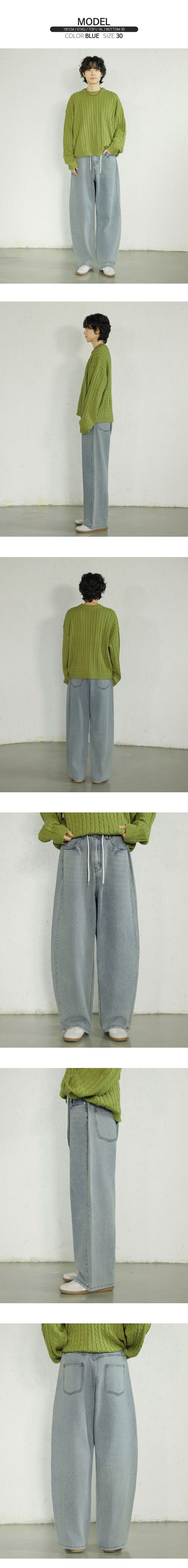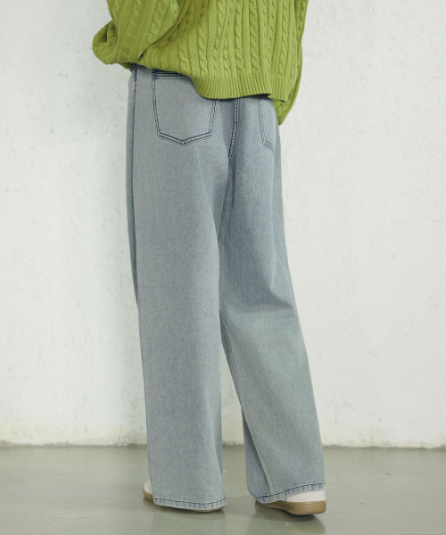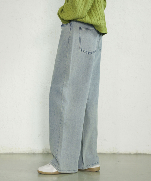뒷밴딩 무지 워싱 와이드 데님 팬츠[인디고블루]
