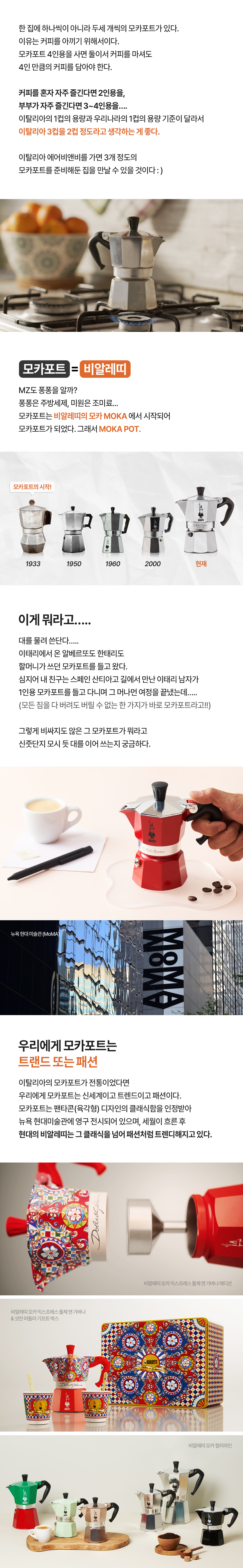 비알레띠(BIALETTI)는 오랜 전통을 가진 모카포트의 대표적인 브랜드입니다. 세계 최초로 가정용 에스프레소 커피메이커를 개발한 비알레띠는 1933년에 창립되어, 끊임없는 연구 개발을 통해 전통과 기술 혁신을 겸비한 완벽한 제품을 생산하고 있습니다.