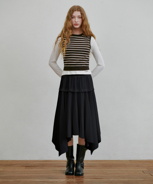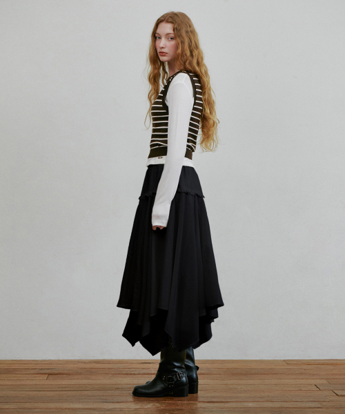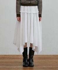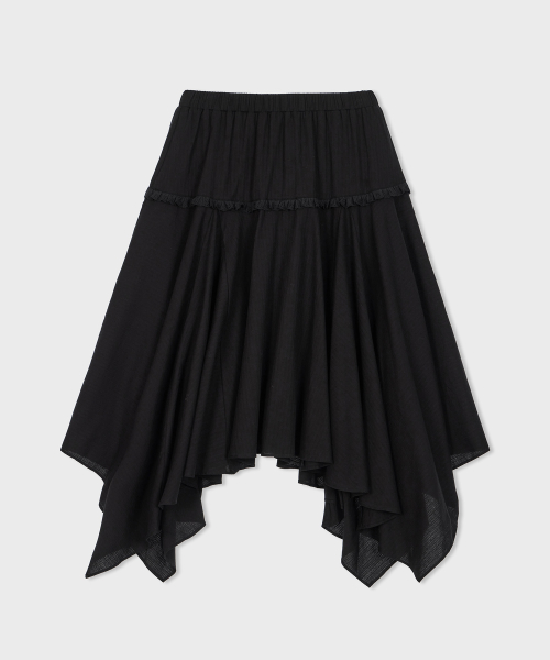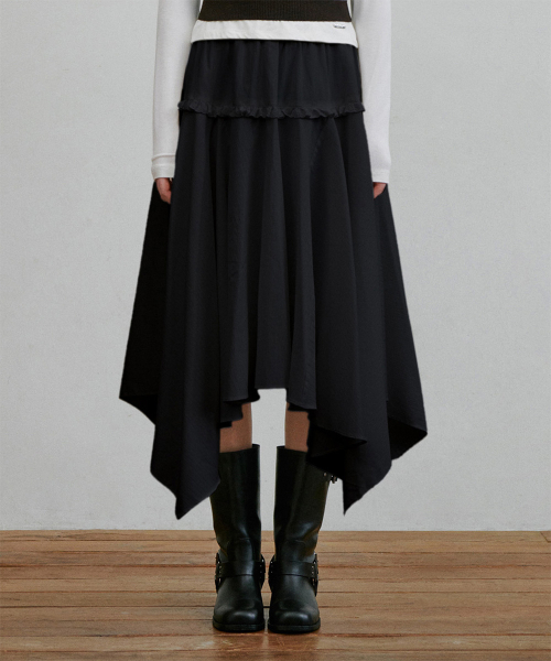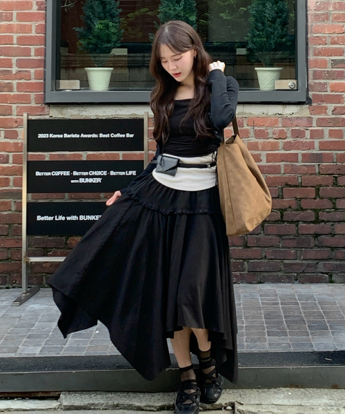 캉캉 프릴 플레어 리본 셔링 롱 코튼 스커트 [블랙]