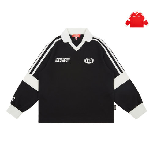아이스비스킷 레터 그래픽과 소매 컬러 배색이 돋보이는 저지 카라 티셔츠입니다.