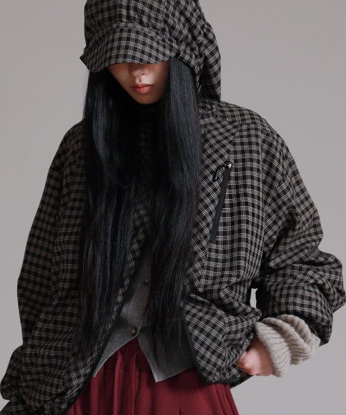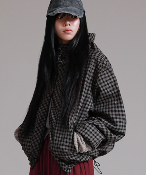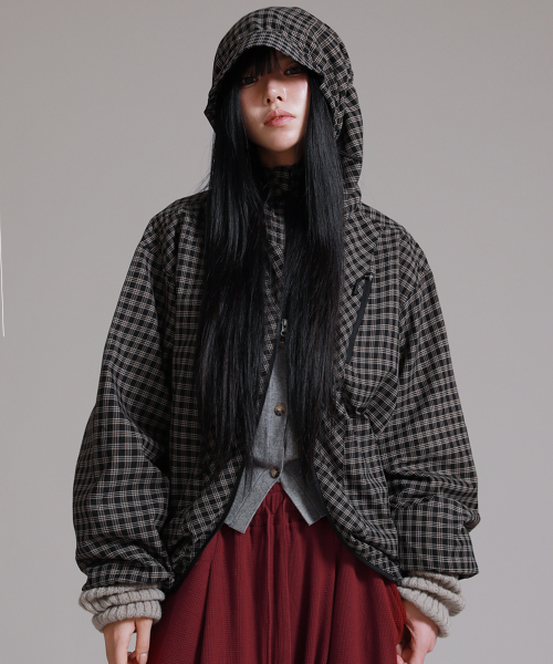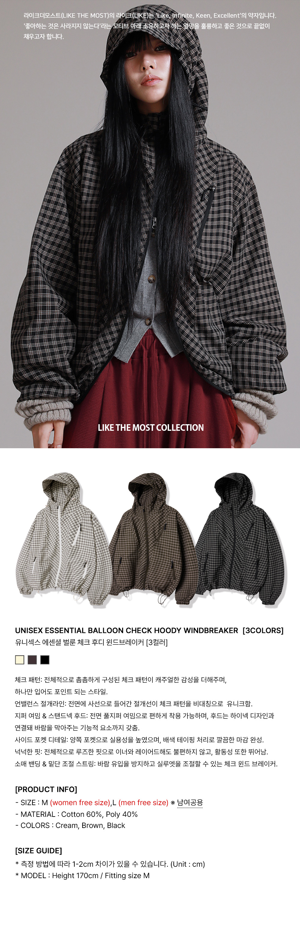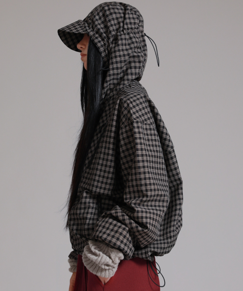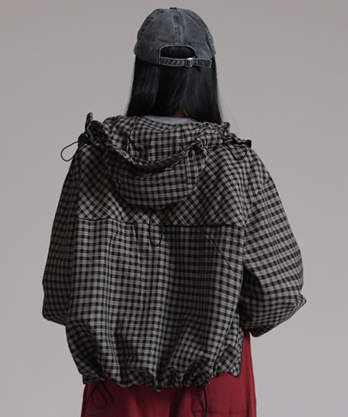 유니섹스 에센셜 벌룬 체크 후디 윈드브레이커_브라운