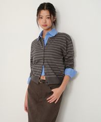 우먼즈 스트라이프 라운드 넥 가디건 [다크 그레이]